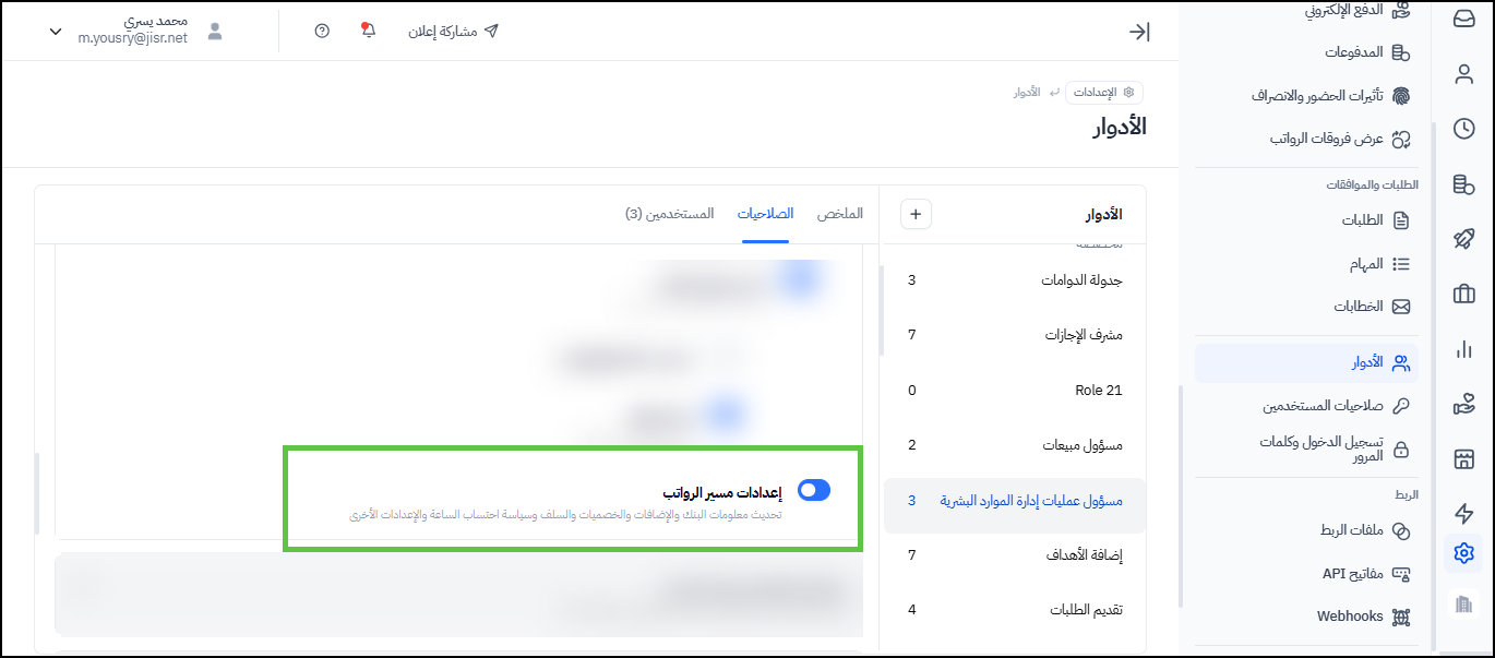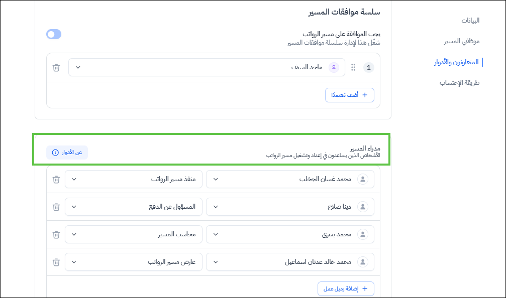 ملحوظة 2: عند تعريف مسير الرواتب المتعددة للمستخدم لأول مرة، سيكون المستخدم الذي له دور "مشرف الرواتب" هو المستخدم الذي مفعل له صلاحية "إعدادات مسير الرواتب"