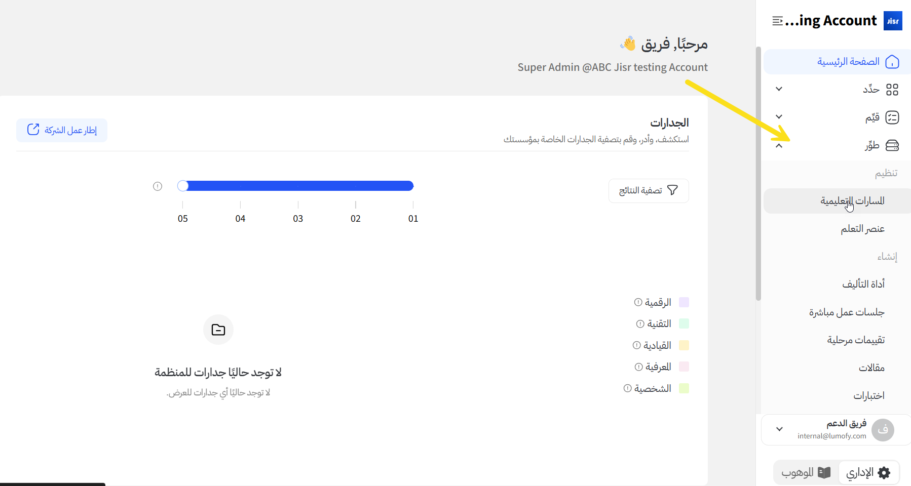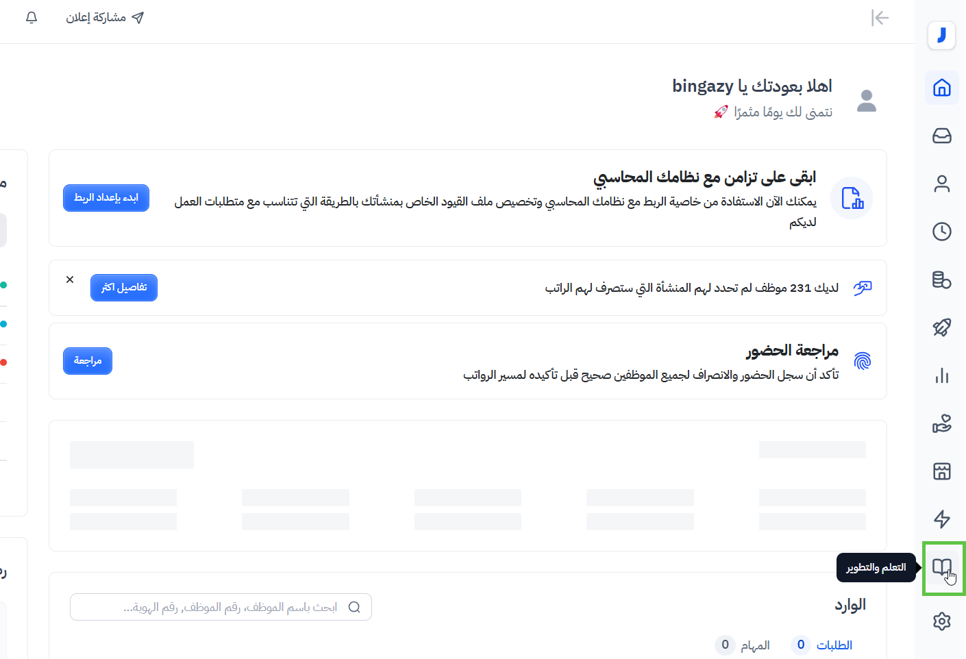 يمكن للـ Superadmins والمتعلمين من الوصول إلى الواجهة الخاصة بهم من خلال تبويب "التعلم والتطوير" في الشريط الجانبي.
