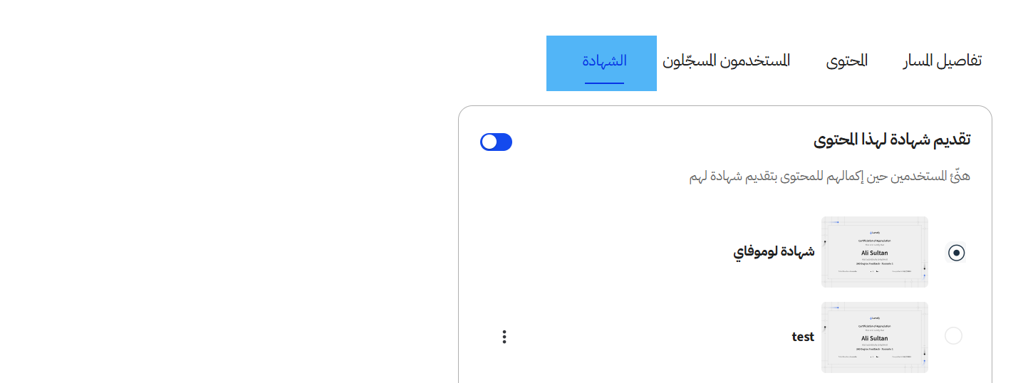 من علامة التبويب "الشهادة"، يمكنك التحكم في ما إذا كان هناك شهادة ستُمنح لهذا المسار. يمكنك اختيار شهادة لوموفاي الافتراضية أو تصميم شهادة مخصصة خصيصًا لهذا المسار.