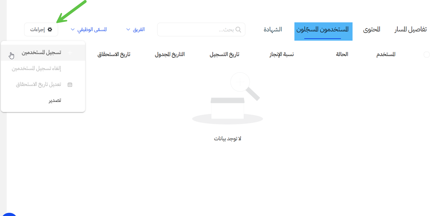 لإضافة الموظفين إلى مسارك، اضغط على "المستخدمون المسجّلون"، ثم اختر "تسجيل المستخدمين" من قائمة "الإجراءات". سيسمح لك ذلك ببدء إضافة الموظفين من القائمة المتاحة، وتحديد تاريخ البدء المجدول لعملية تعلمهم، وتحديد تاريخ الاستحقاق لإكمال جميع العناصر التعليمية المعينة.