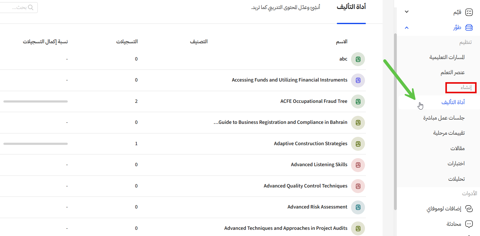 أداة التأليف تقع ضمن قسم "إنشاء"، وتتيح لك إنشاء محتوى تفاعلي باستخدام عناصر تعليمية متنوعة تُضاف إلى المسار.