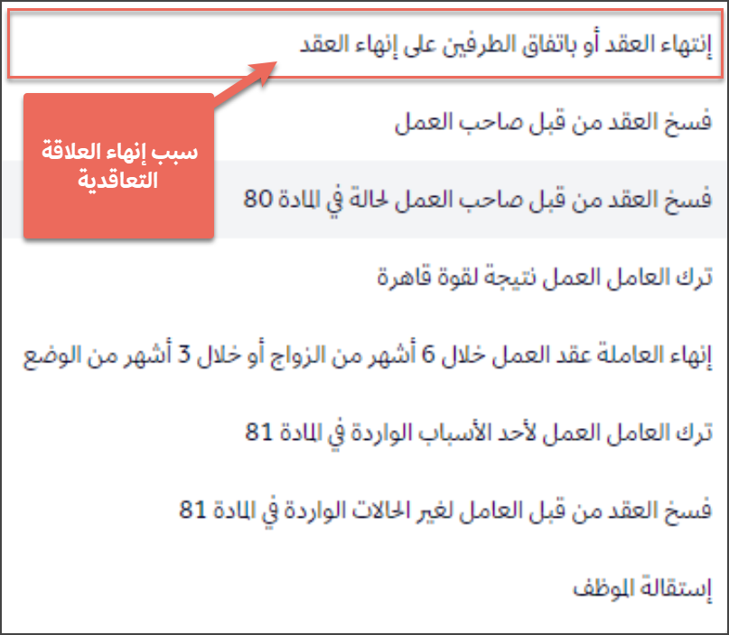 يتم اختيار سبب إنهاء العلاقة التعاقدية كالتالي :