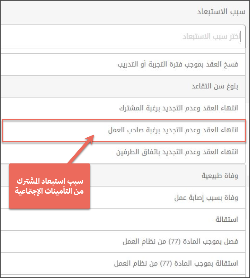 يلزم التنبه لوجود فرق بين اختيار سبب انتهاء العلاقة التعاقدية بموجب نظام العمل عن سبب الاستبعاد من التأمينات الاجتماعية بموجب الأسباب المتاحة من قبل التأمينات الاجتماعية.