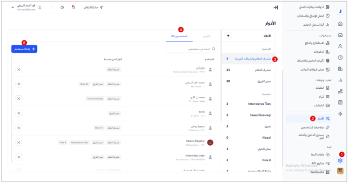 5- النقر على "إضافة مستخدم" واختيار المستخدمين المراد إعطاؤهم صلاحية "مشرف النظام والشركات الفرعية".
