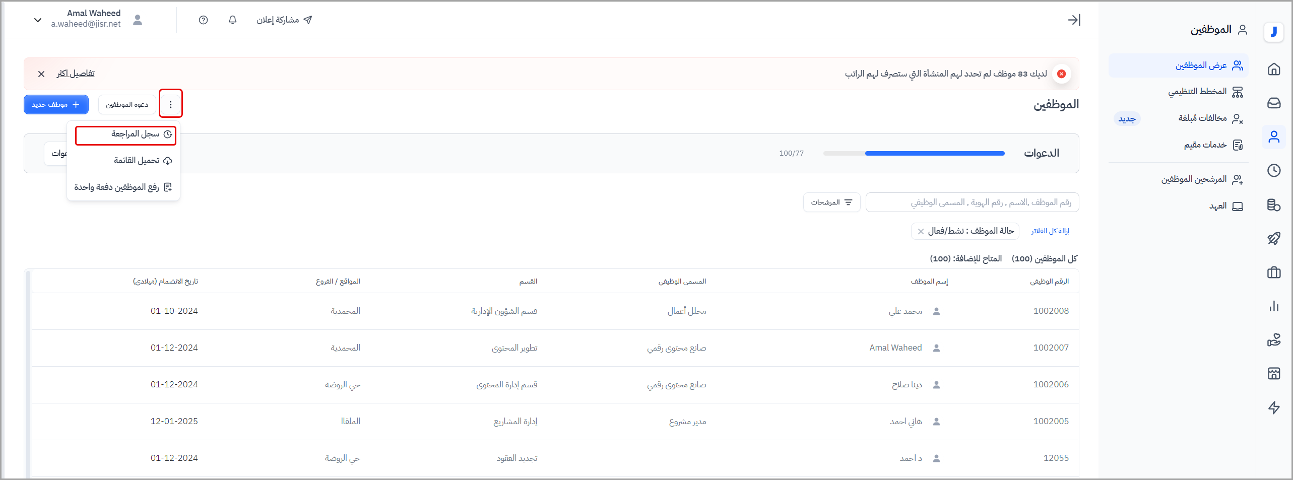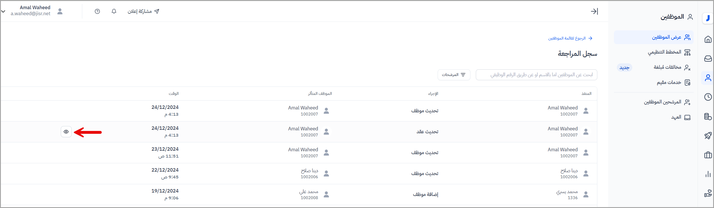 - للاطلاع على سجل المراجعة، انتقل إلى قائمة الموظفين، ثم إلى تبويب "عرض الموظفين"، واضغط على زر "سجل المراجعة" كما هو موضح أدناه.
