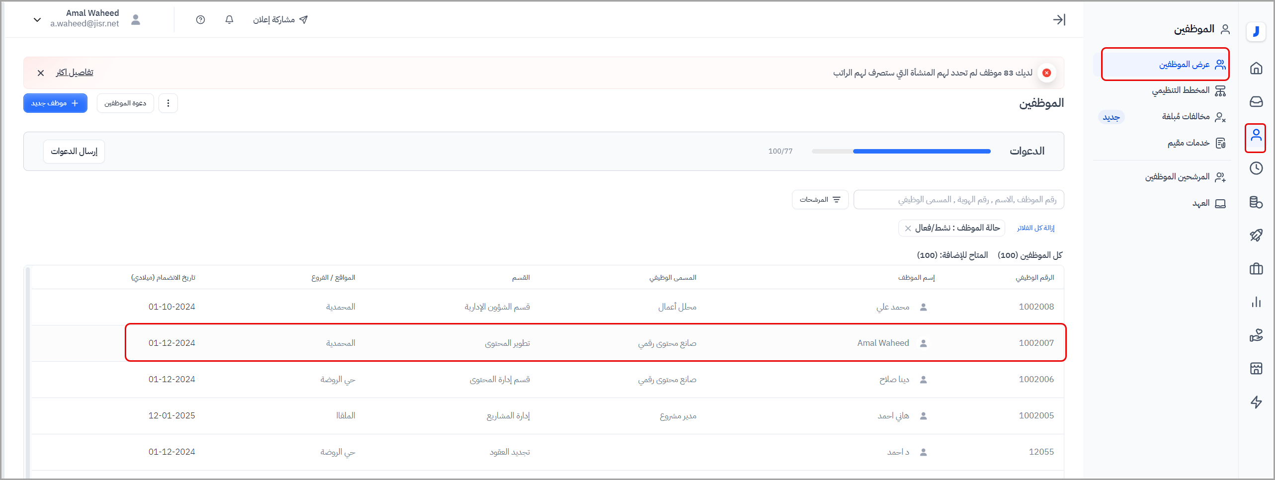 يمكن للمشرف أيضًا الاطلاع على تاريخ التعديلات التي أجريت على عقد موظف معين من خلال الانتقال إلى قائمة الموظفين، ثم تبويب "عرض الموظفين"، واختيار "المعلومات الوظيفية"، ومن ثم تحديد الموظف المطلوب.