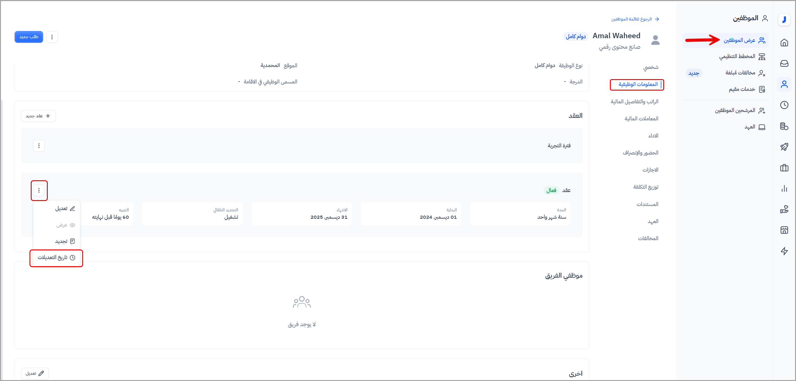 من تبويب المعلومات الوظيفية، في خانة العقد، قم بالضغط على علامة القائمة، ثم اختر "تاريخ التعديلات".