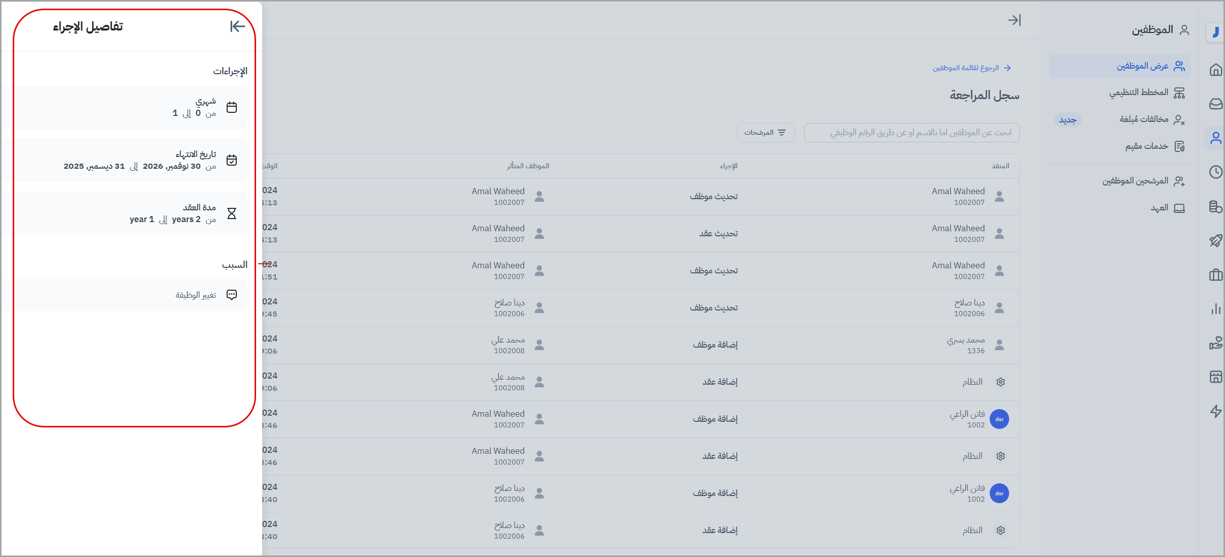 3. ستظهر نافذة جانبية تعرض تفاصيل الإجراء الذي تم على العقد الخاص بالموظف.