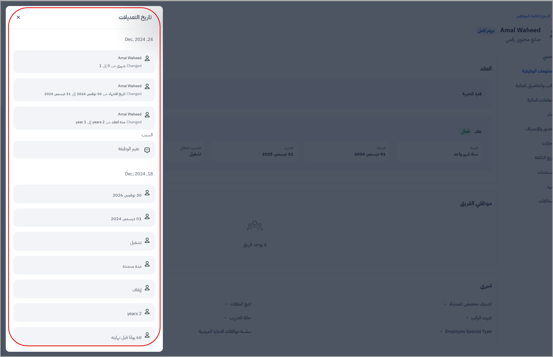 سيعرض النظام تاريخ التعديلات التي أجريت على عقد الموظف.