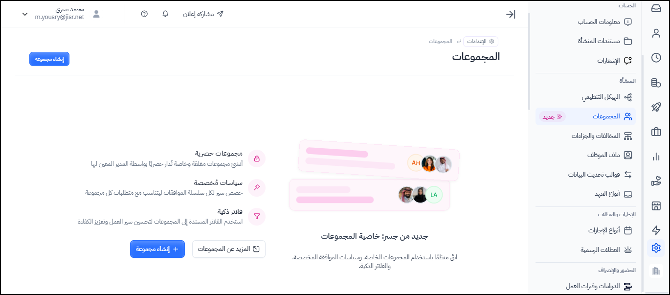 تهدف هذه الميزة إلى تمكين المستخدمين من إنشاء وإدارة مجموعات مخصصة من الموظفين بناءً على سمات متنوعة، مثل الموقع والجنسية ونوع التوظيف. من خلال هذه الميزة، يمكن للمستخدمين تنفيذ إجراءات محددة على مجموعات معينة، مما يحسن الكفاءة التشغيلية ويقلل من المهام الإدارية المتكررة.