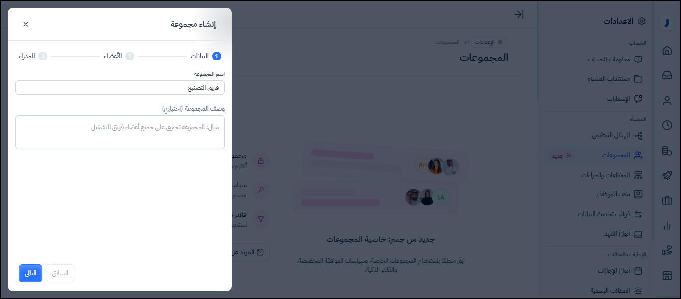 2- يقوم المستخدم بإدخال اسم المجموعة ووصف للمجموعة إن وجد.