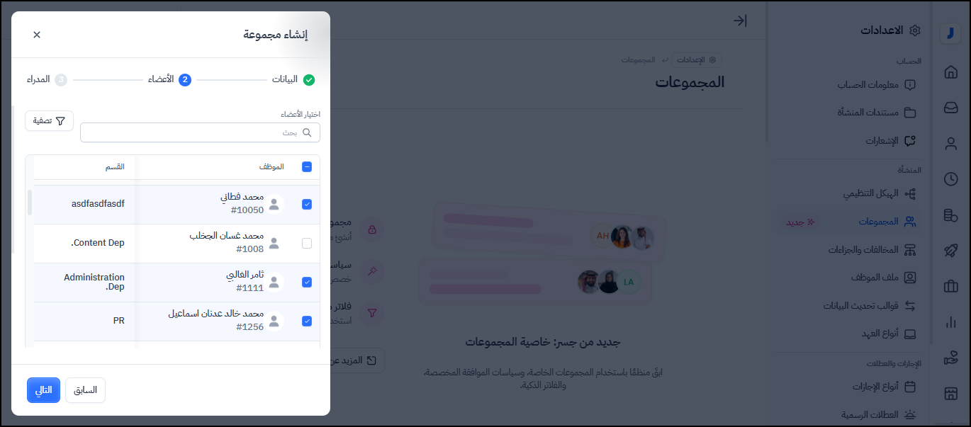 3- اختيار الموظفين الذين سيكون متواجدين بالمجموعة