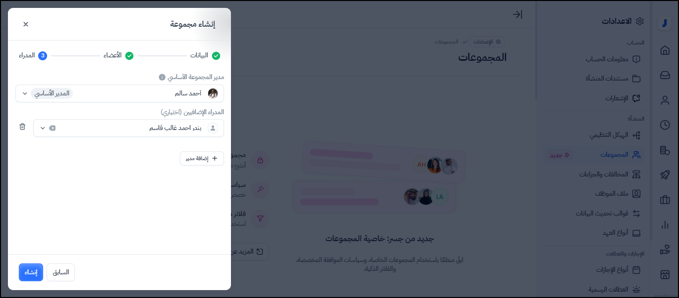 4- ثم يقوم المستخدم باختيار المديرين على المجموعة (علماً بإن المديرين الذي سيظهرون في القائمة هما بالفعل المستخدمين الذين فعل لهم صلاحية "مدير المجموعة".