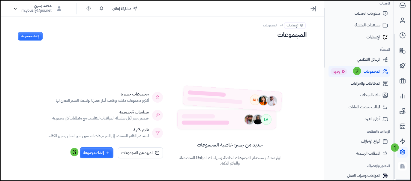1- يقوم المستخدم بالنقر على "الإعدادات" ثم اختيار "مجموعات"، ثم النقر على "إنشاء مجموعة"