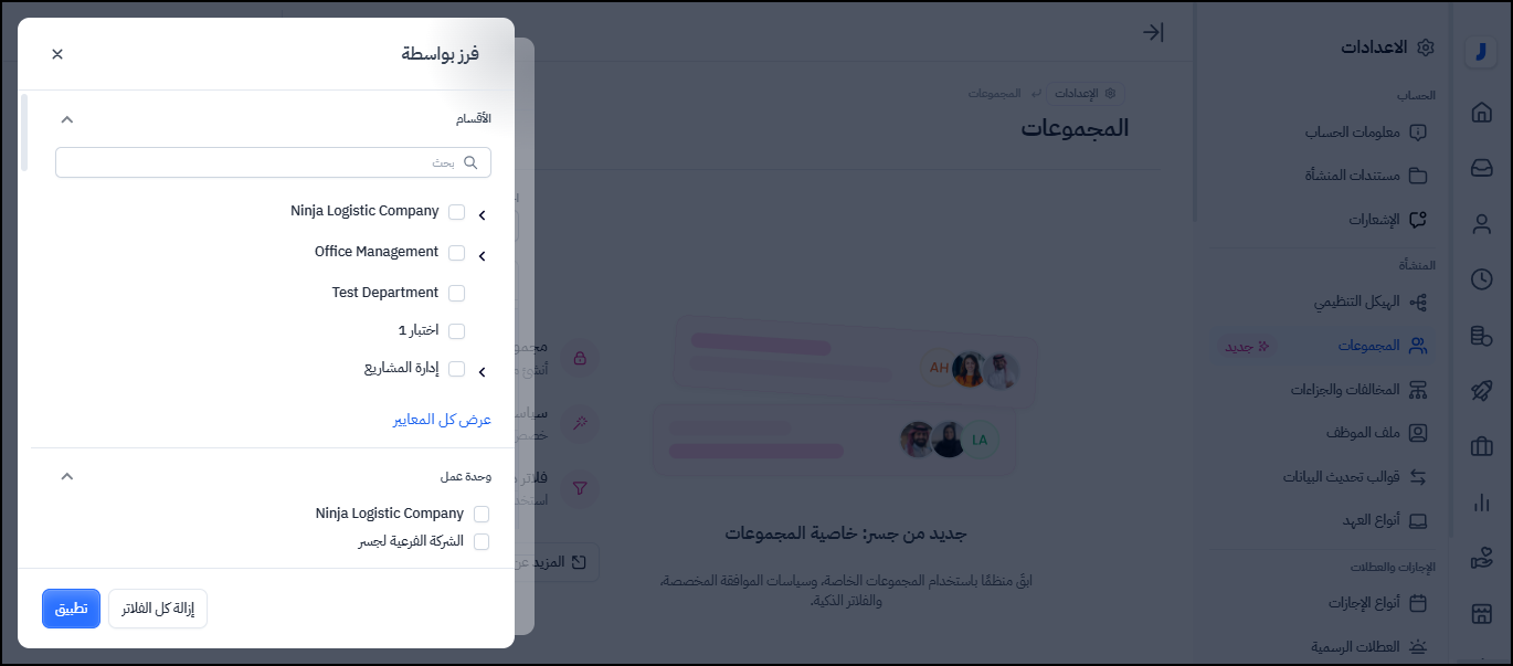 كما يمكن استخدام الفلتر للبحث عن أحد الموظفين، لإضافتهم في المجموعة