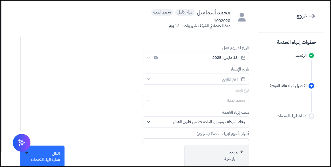 من أجل احتساب كامل المكافأة بناء على المادة 84 في جسر يتم اختيار سبب إنهاء الخدمة: وفاة الموظف بموجب المادة 79 من قانون العمل.