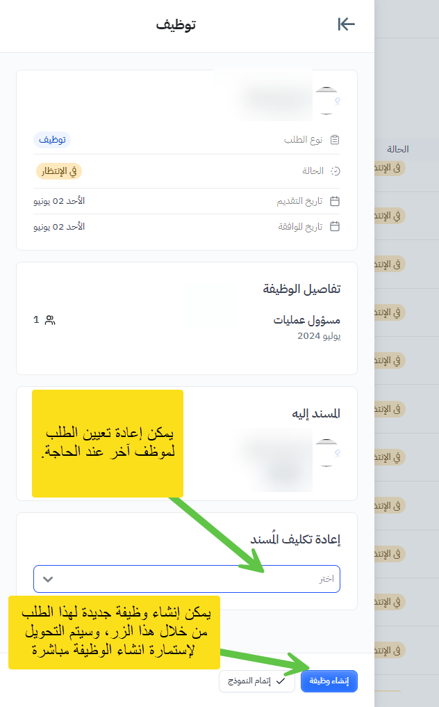 3. إضافة إمكانية لإنشاء وظيفة جديدة من نافذة مهمة التوظيف وذلك لإعادة توجيه المستخدم للإستمارة الخاصة بإنشاء وظيفة بسهولة مع ملء جميع الحقول مسبقًا.