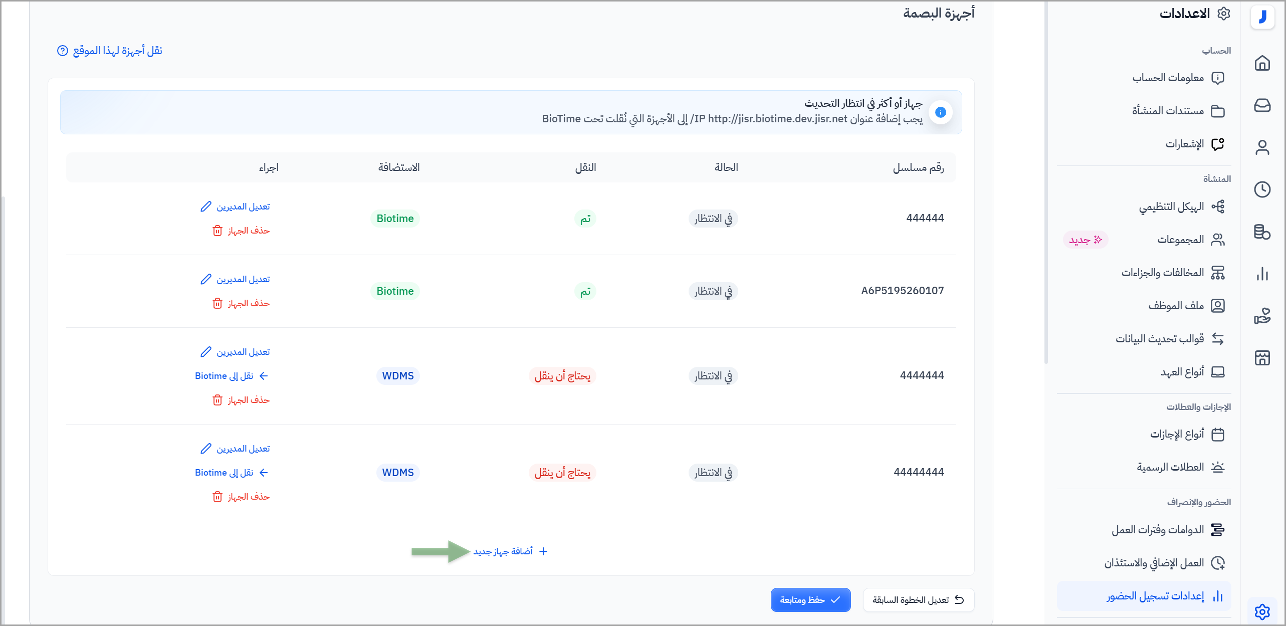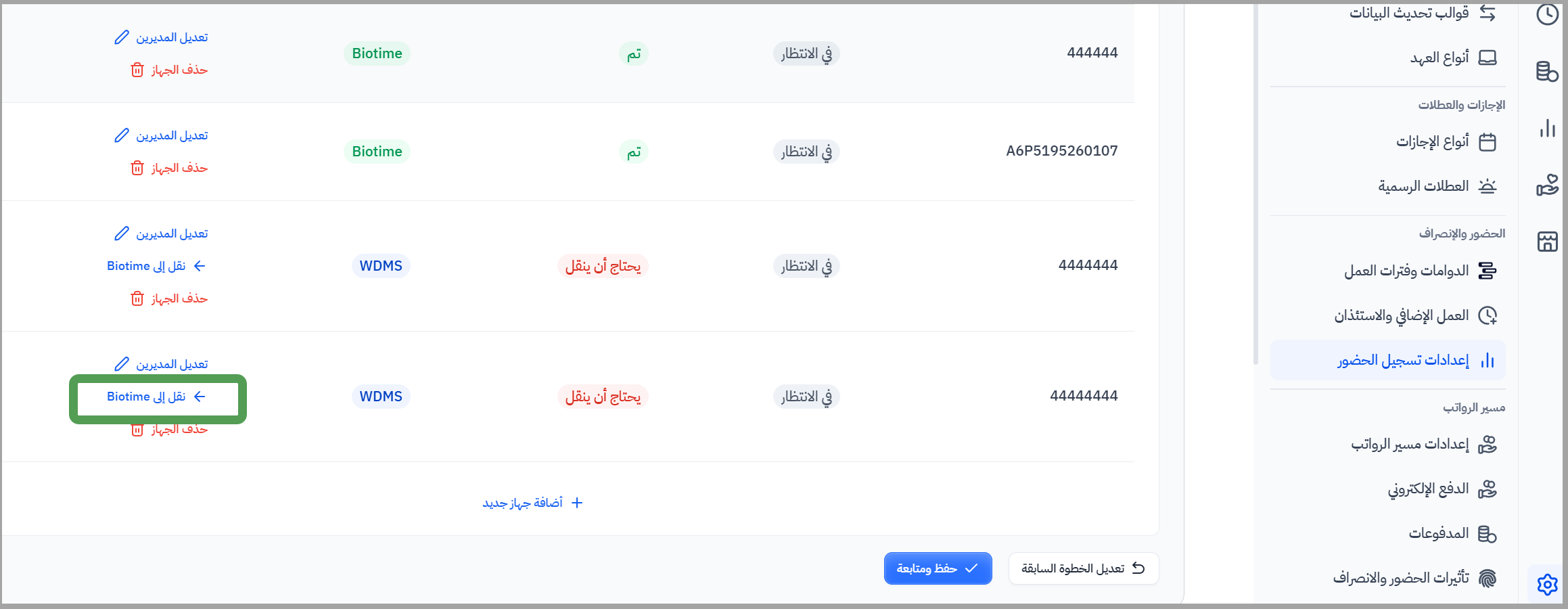 انتقل إلى إعدادات تسجيل الحضور، تبويب آليات تسجيل الحضور، حيث ستظهر لك قائمة المواقع والأجهزة المرتبطة بها. في حال وجود أجهزة تحتاج إلى نقل ، ستظهر لك رسالة تفيد بذلك كما هو موضح بالصورة.