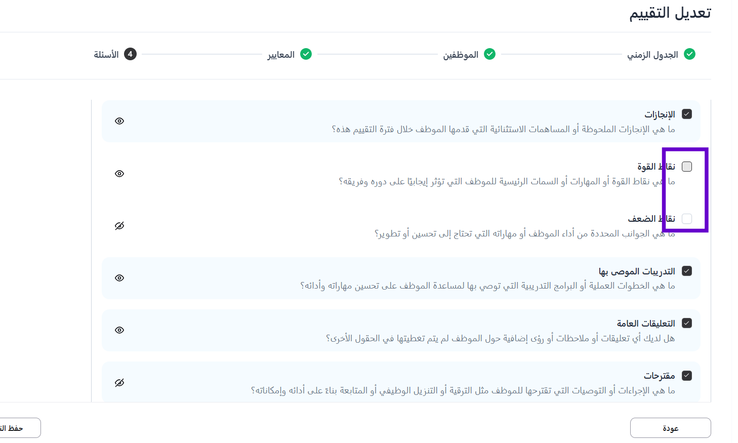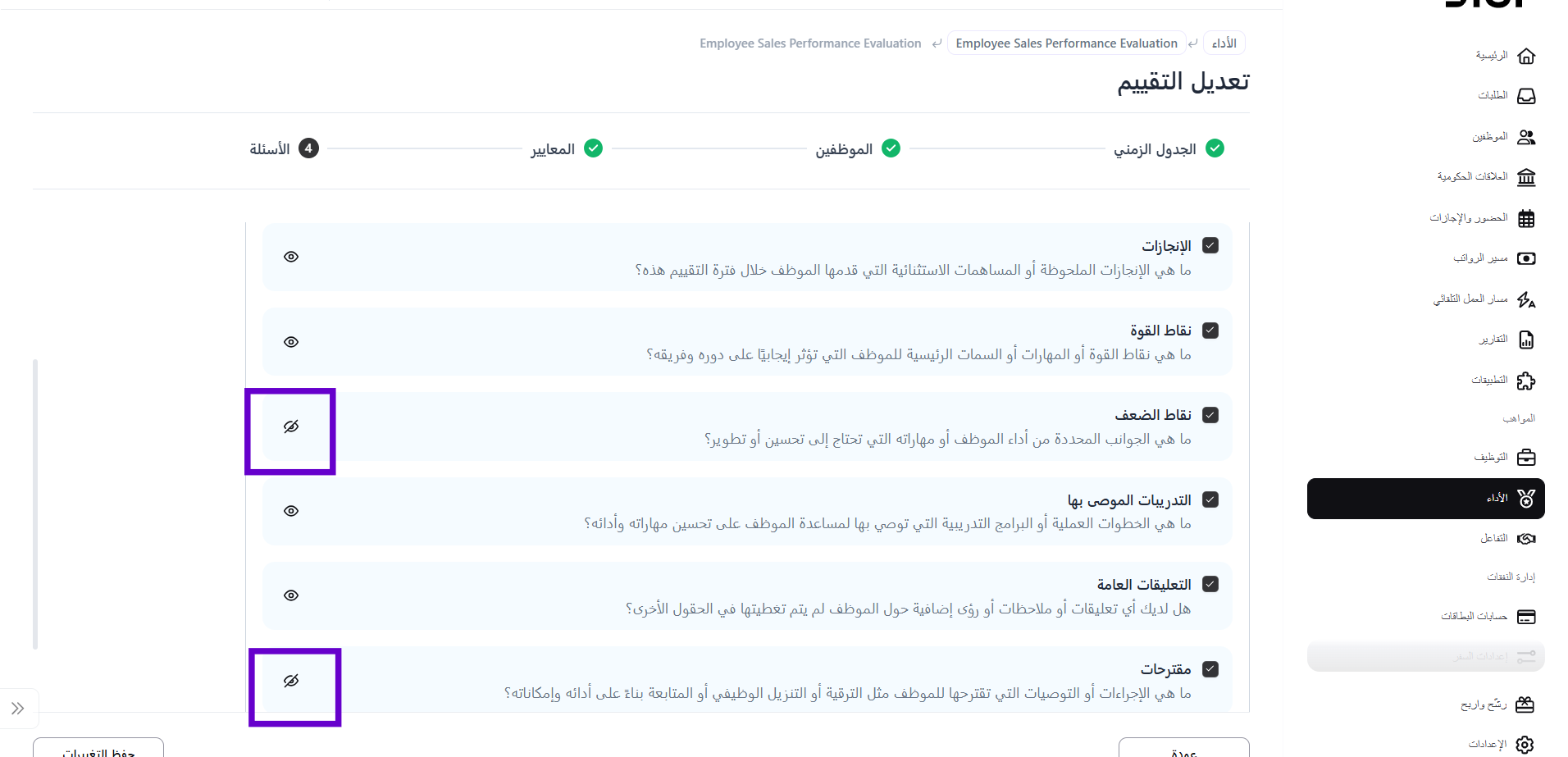 - يمكن للمستخدم تفعيل أو إخفاء أي سؤال عن الموظف الذي يتم تقييمه في تقييم المدير للموظف.