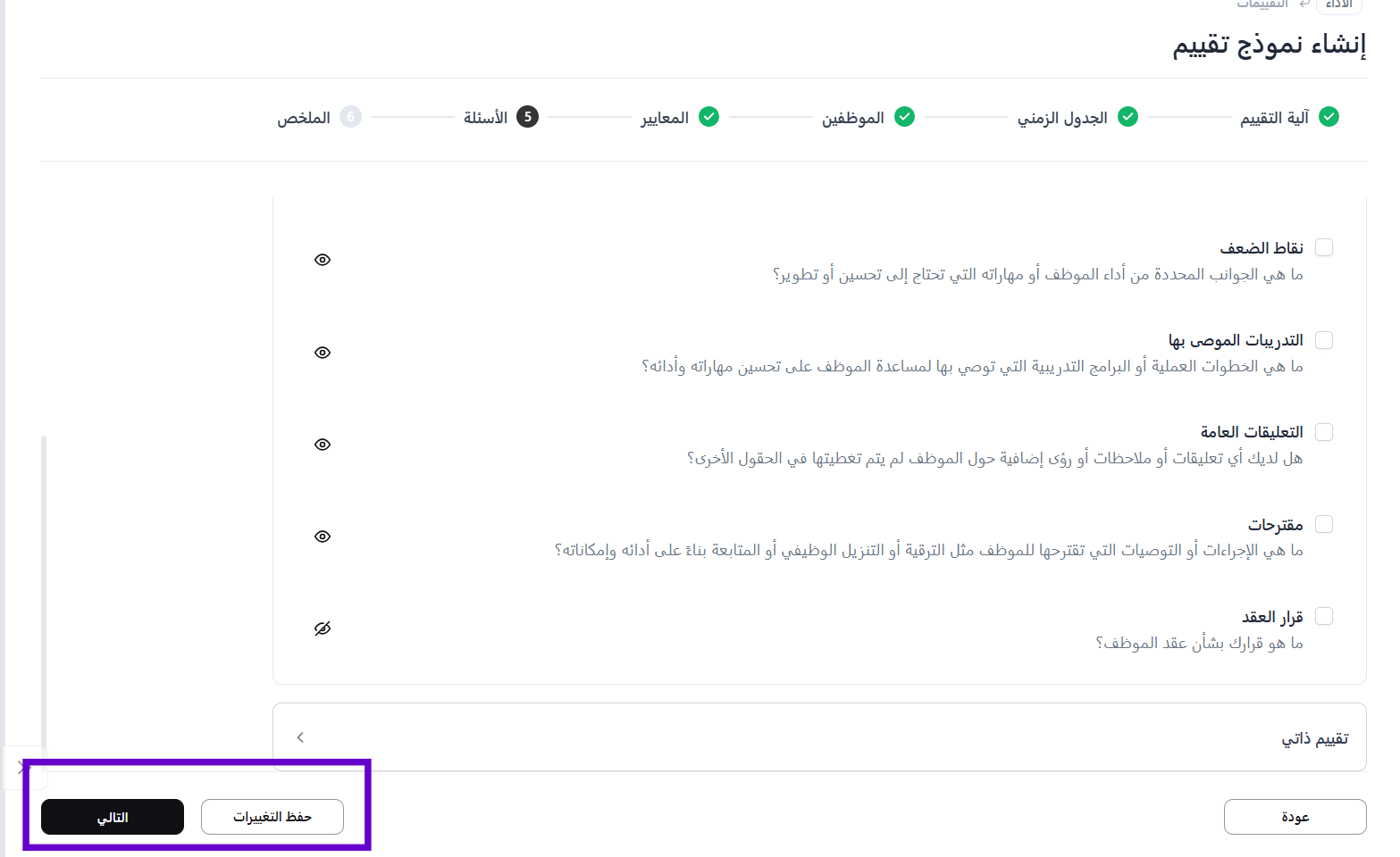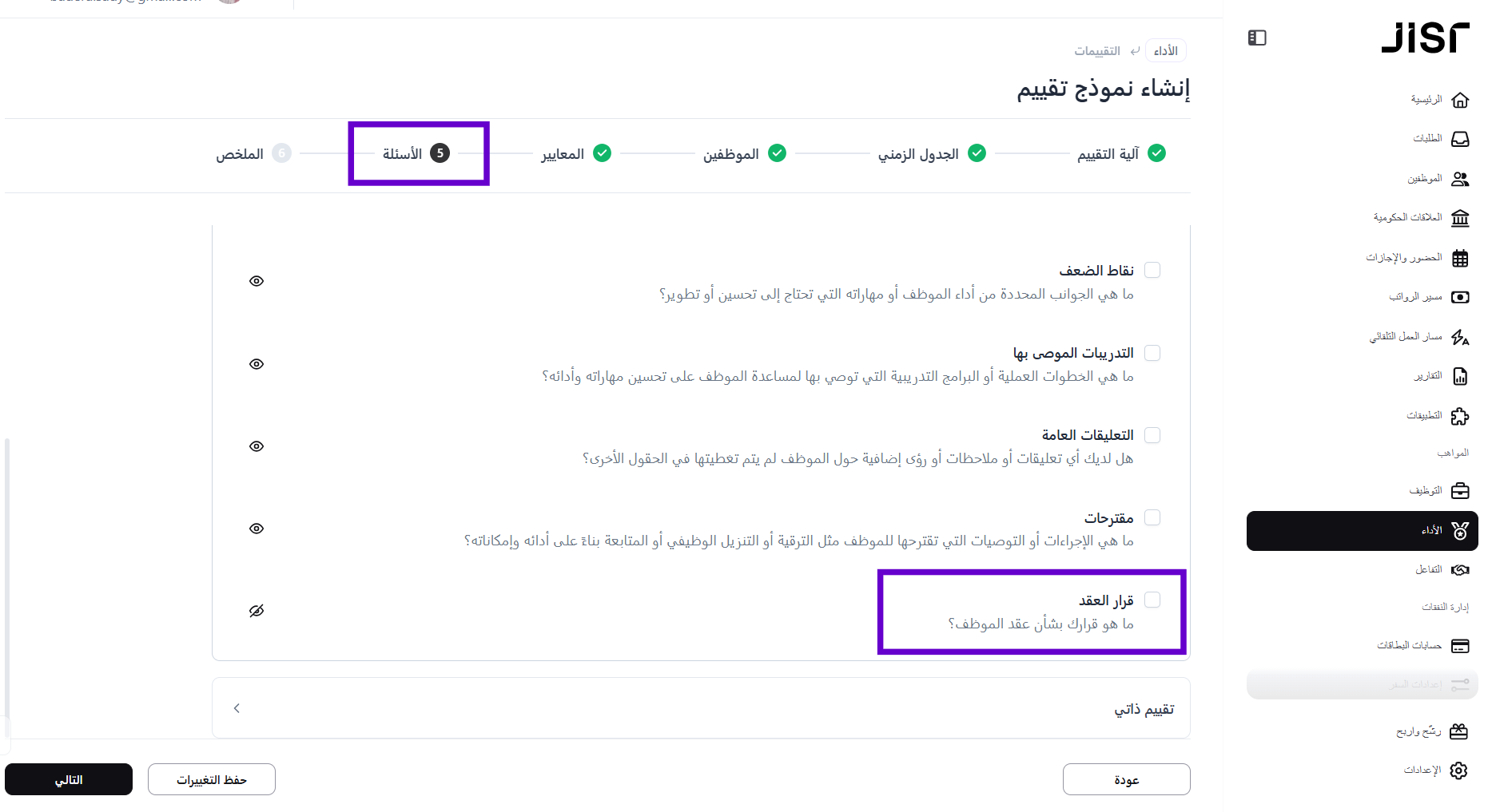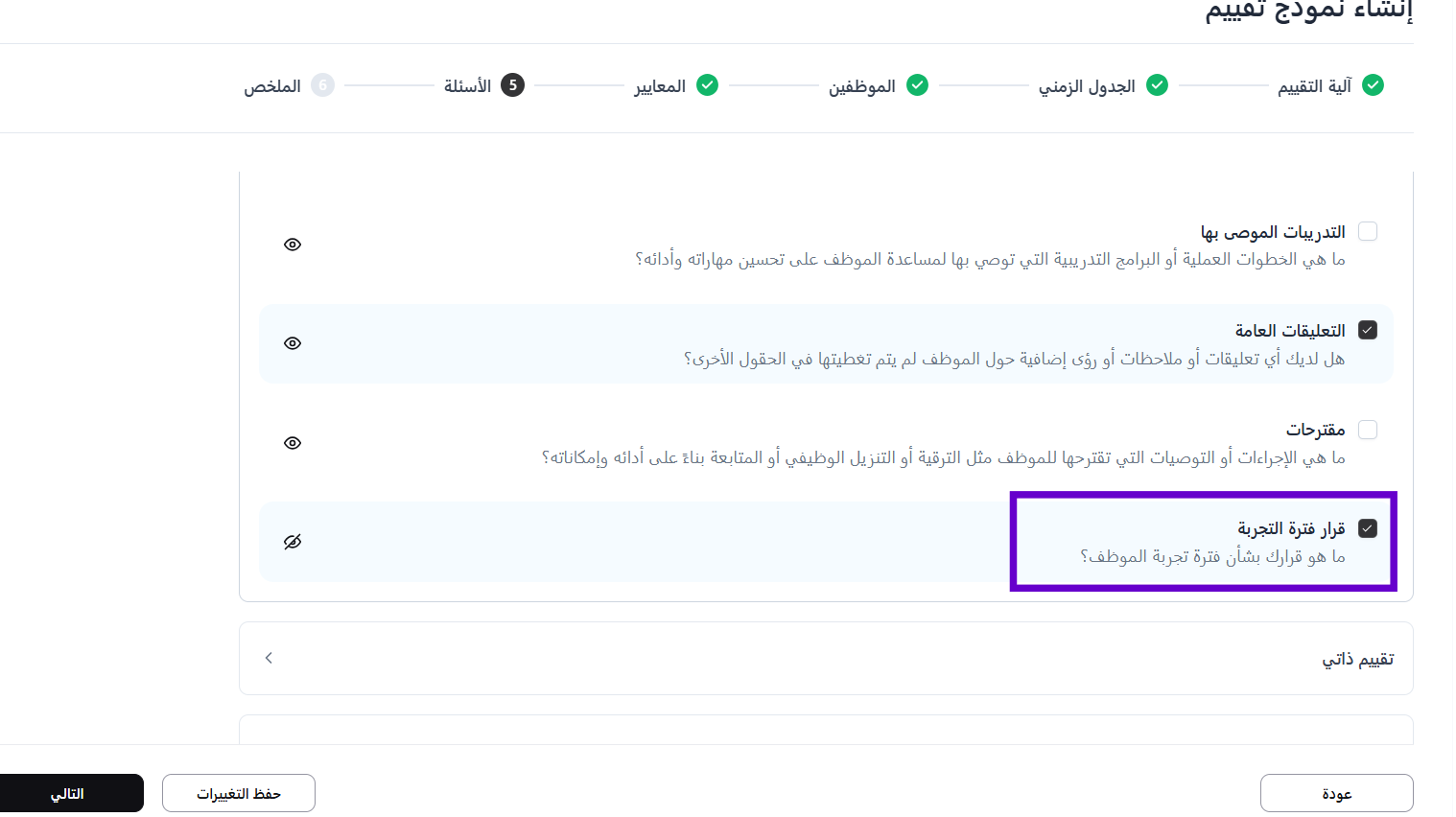 بعد إنشاء المعايير في نموذج التقييم وحفظها، تأتي الخطوة الرابعة والأخيرة وهي إضافة جزء "الأسئلة والقرارات"، وذلك لتحقيق عملية تقييم منظمة تساعد المديرين في توثيق أداء الموظفين بشكل مفصّل لتسهيل اتخاذ القرارات الإدارية مثل التوصيات الخاصة بتمديد فترة التجربة، التدريب، الترقيات، أو تجديد العقود.