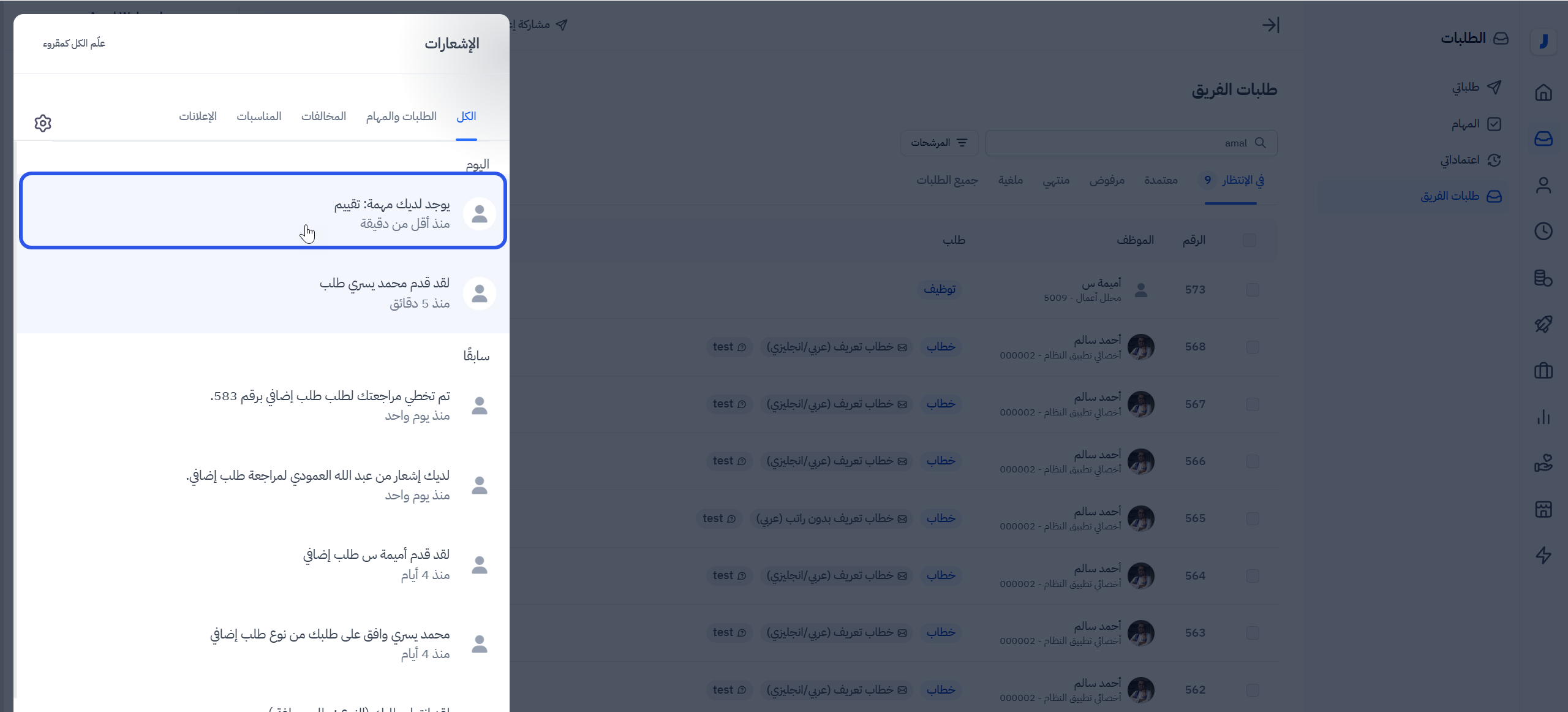 إنشاء المهمة تلقائيًا: بمجرد الموافقة على الطلب، يقوم النظام بإنشاء مهمة مرتبطة به تلقائيًا وإسنادها إلى المستخدمين المسؤولين عن تنفيذها.