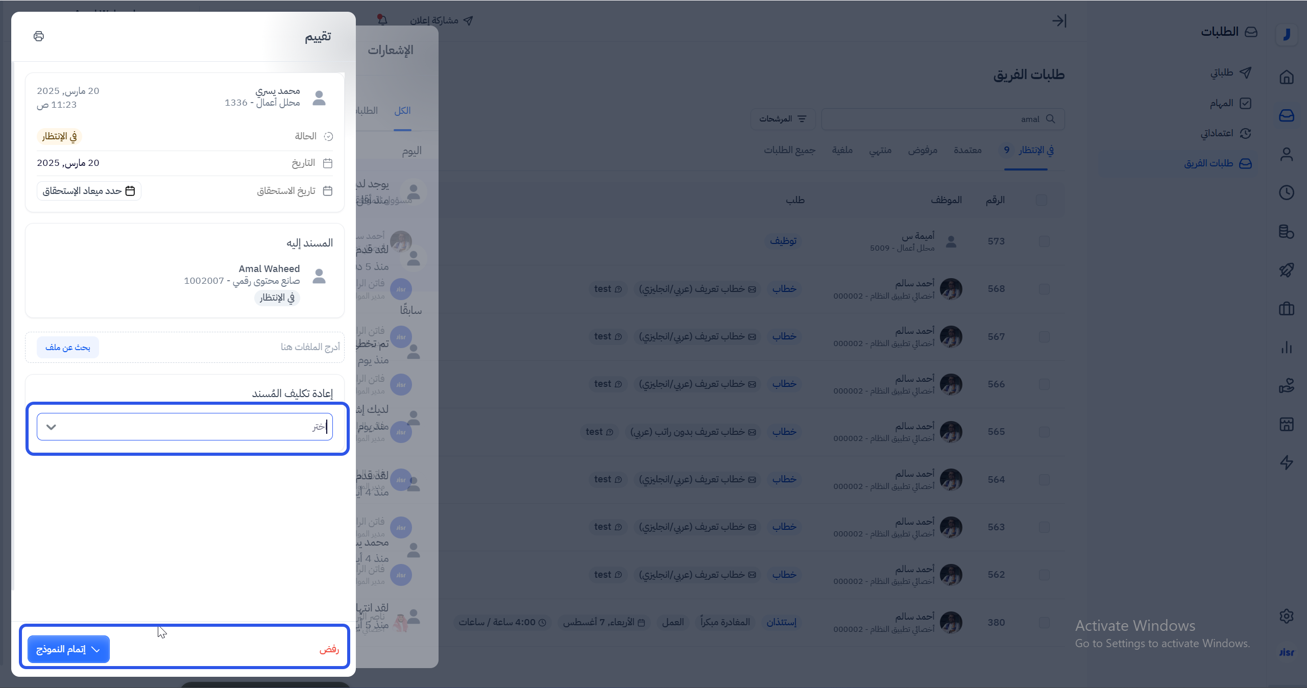 يمكن للموظف إعادة إسناد المهمة إلى موظف آخر من خلال اختيار اسم من القائمة. كما يمكنه أيضًا اتخاذ إجراء الموافقة على المهمة أو رفضها.