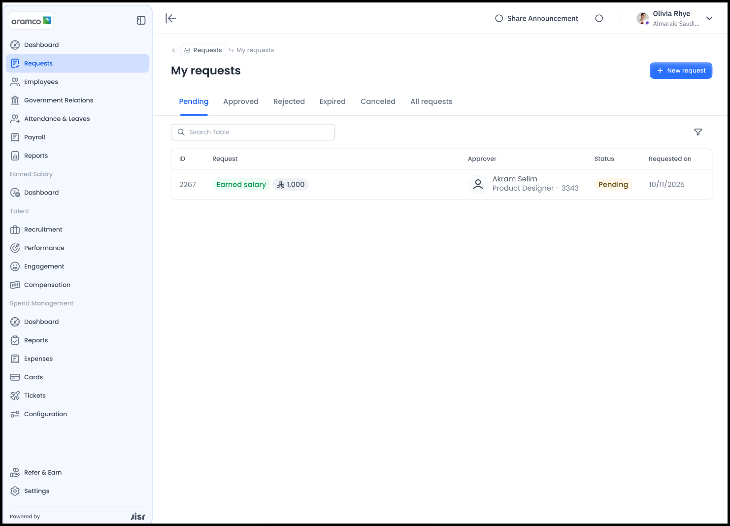 1- ليقوم مسؤول الموافقة بفتح شاشة "الطلبات" ليجد الطلب (قيد التنفيذ) الخاص بالوصول إلى الراتب المكتسب.