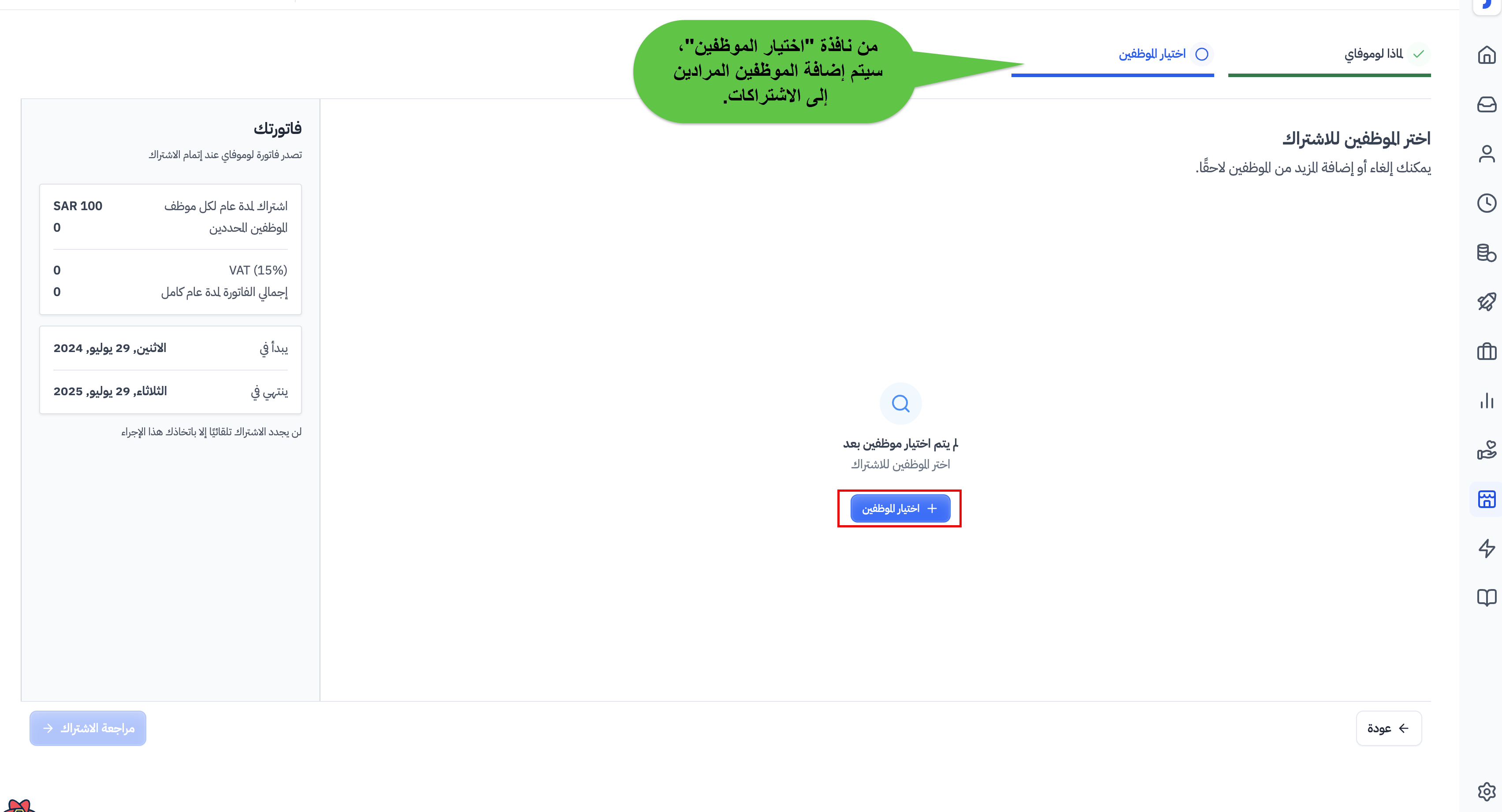 أثناء الاشتراك من داخل "المتجر" في نظام جسر، ستكون الخطوة التالية قبل إصدار الفاتورة هي "إضافة الموظفين" والتي تسمح بإضافة أي عدد من الموظفين لهذا الاشتراك حتى يتمكنوا من الاستفادة من محتويات لوموفاي التعليمية.
