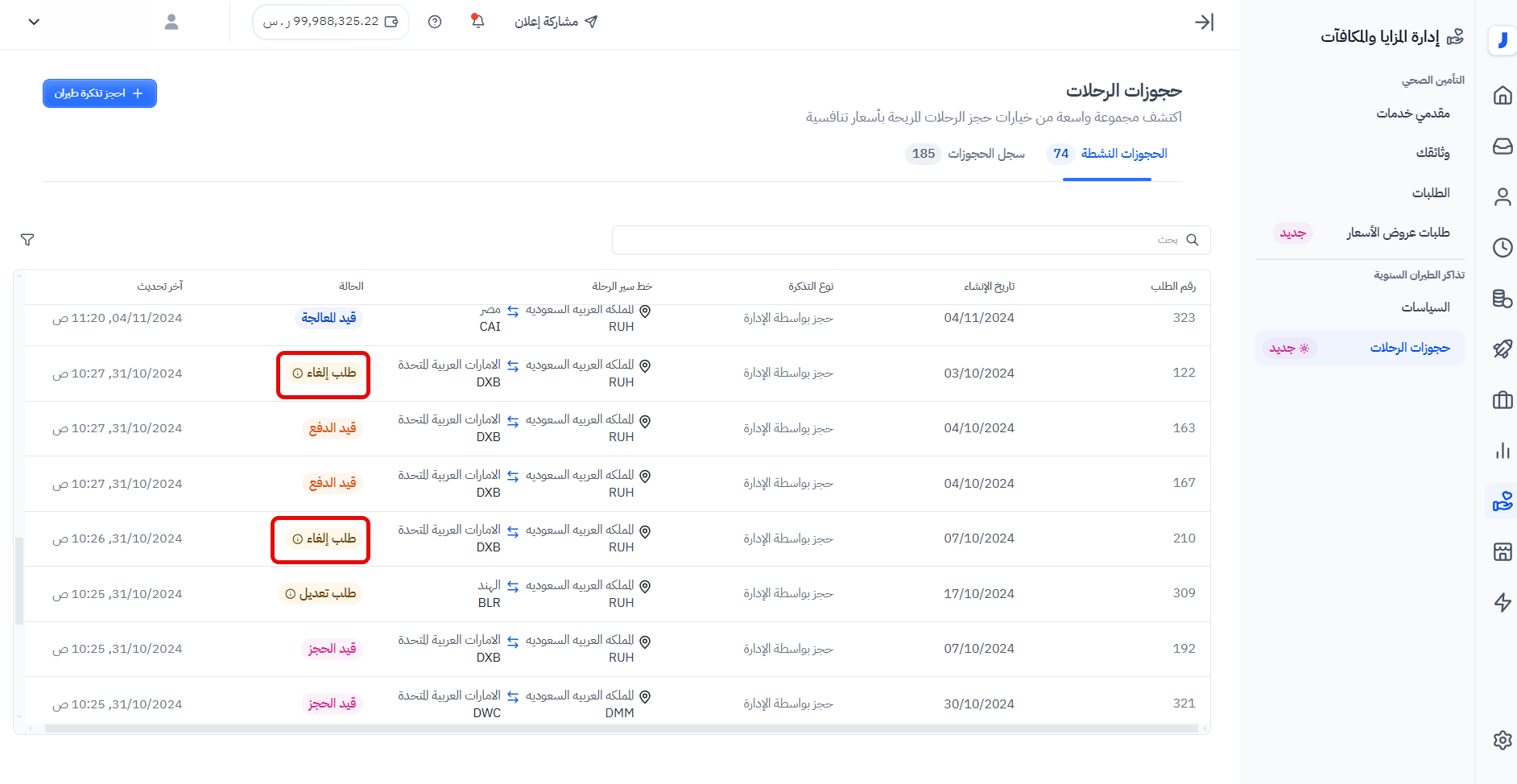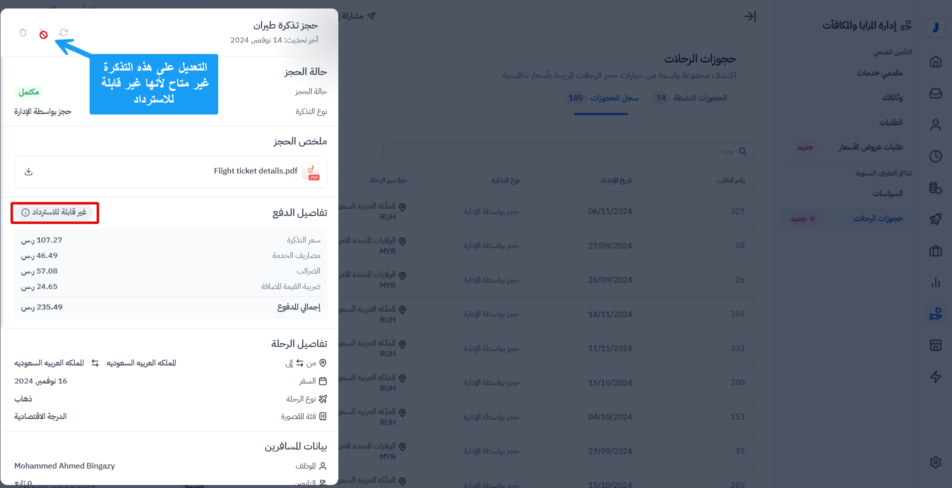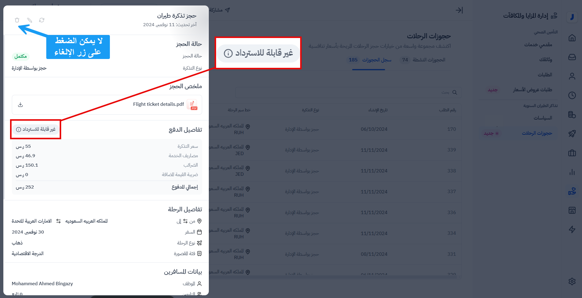 - في حالة رفض طلب الإلغاء من قبل المسافر، أي رفض طلب أن يلغي المستخدم التذكر ويسترد قيمتها، ستعود حالة حجز التذكرة إلى مكتملة مرة أخرى وستضاف إلى سجل الحجوزات.
