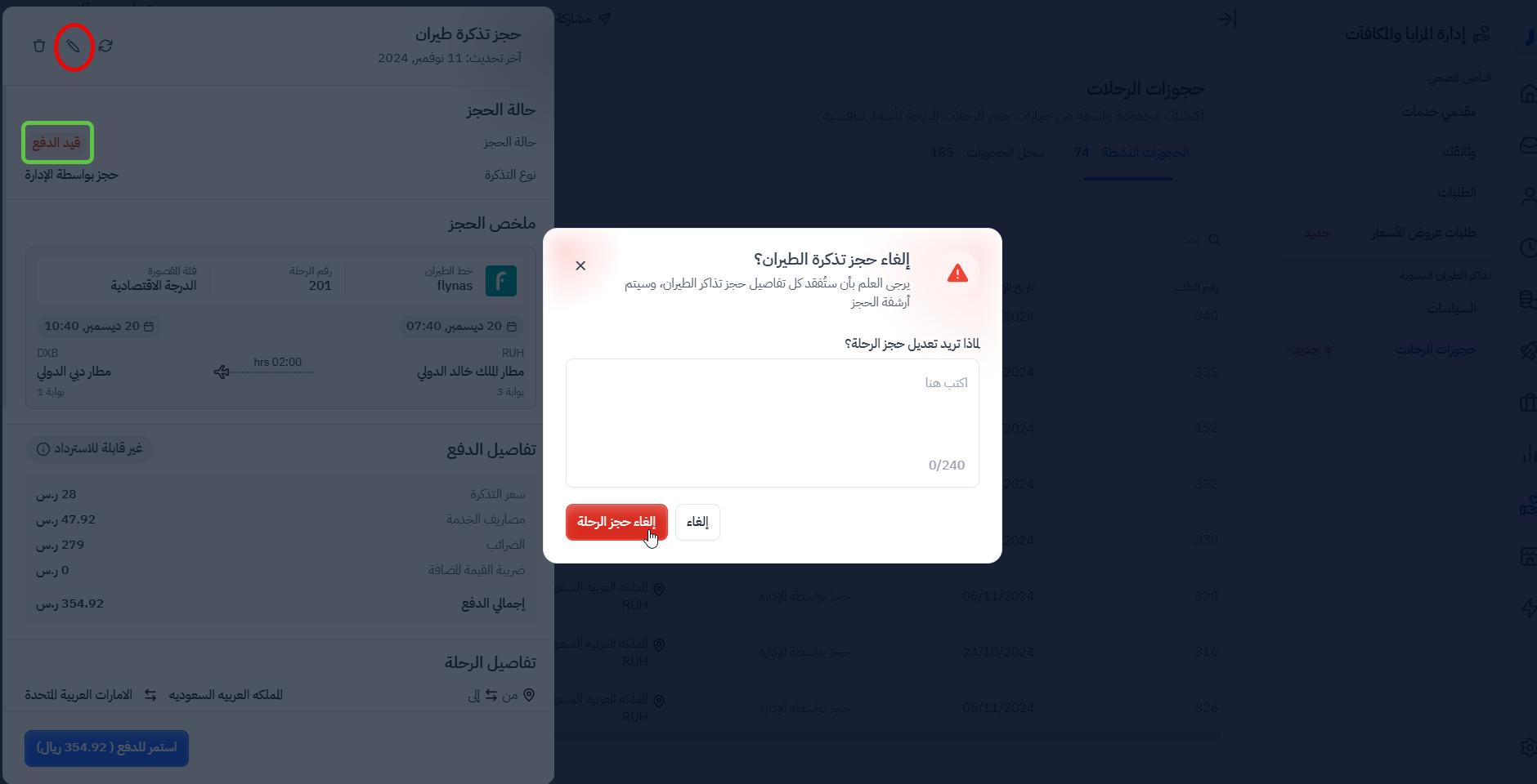 يمكن إلغاء التذاكر غير المدفوعة ذات الحالة 'قيد الدفع' بسهولة من خلال تأكيد إلغاء بيانات الحجز.