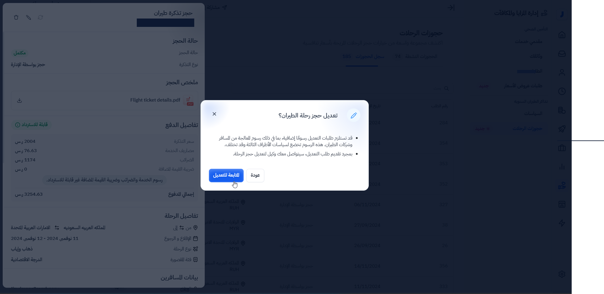 لتعديل تذكرة مكتملة الحجز وقابلة للاسترداد، اضغط على التذكرة التي ترغب في تعديلها من 'سجل الحجوزات'. عند عرضها، اضغط على أيقونة التعديل. ستظهر جميع التعليمات الخاصة بشروط التعديل، بما في ذلك أي رسوم إضافية قد تنطبق وأية معلومات مهمة أخرى.