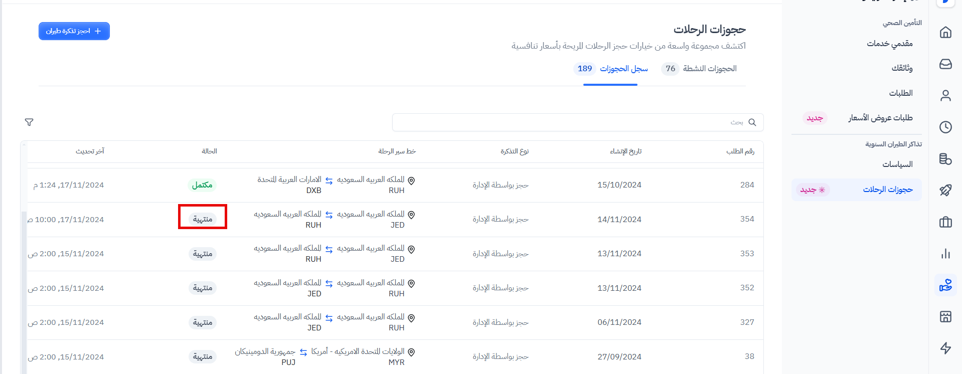 عند بدء عملية حجز تذكرة طيران دون اختيار الرحلة، تكون حالة الحجز 'قيد الحجز'. إذا تُرك الحجز لأكثر من ثلاثة أيام دون اختيار الرحلة، ستتغير حالته إلى 'منتهي الصلاحية' وسيتم نقله إلى قسم 'سجل الحجوزات'.