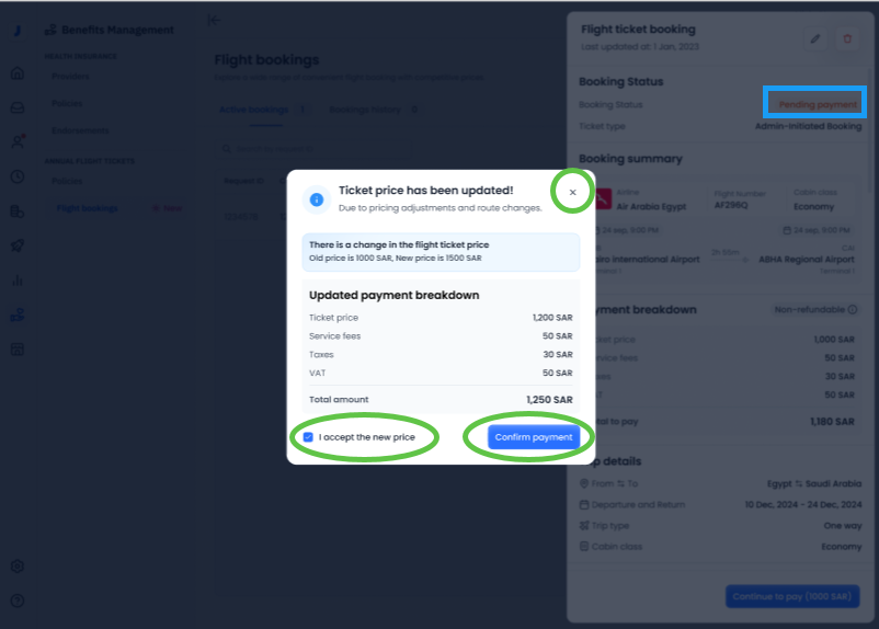 إذا قرر المستخدم لاحقًا إتمام عملية الدفع ووجد تغيُّر في سعر التذكرة، فسيعرض النظام نافذة تحتوي على تنبيه بشأن تغيير السعر. عندها سيكون لدى المستخدم خيارات: قبول السعر الجديد وإتمام عملية الدفع، أو البحث عن رحلات أخرى، أو إلغاء الحجز.