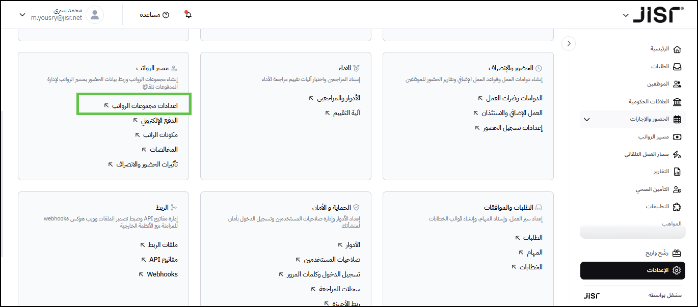 1- يقوم المستخدم بالنقر على الإعدادات ثم "إعدادات مجموعات الرواتب"
