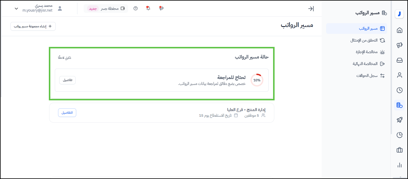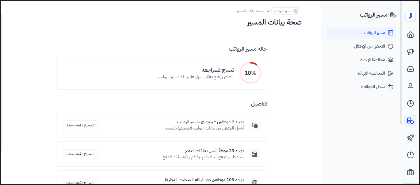 2- ليجد أعلى الشاشة "حالة مسير الرواتب" التي توضح نسبة اكتمال بيانات الموظفين داخل مسيرات الرواتب