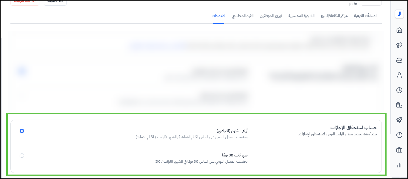 ملحوظة: يتم اختيار طريقة حساب استحقاق الإجازات من خلال تبويب "الإعدادات" في عملية الربط المحاسبي مع النظام.