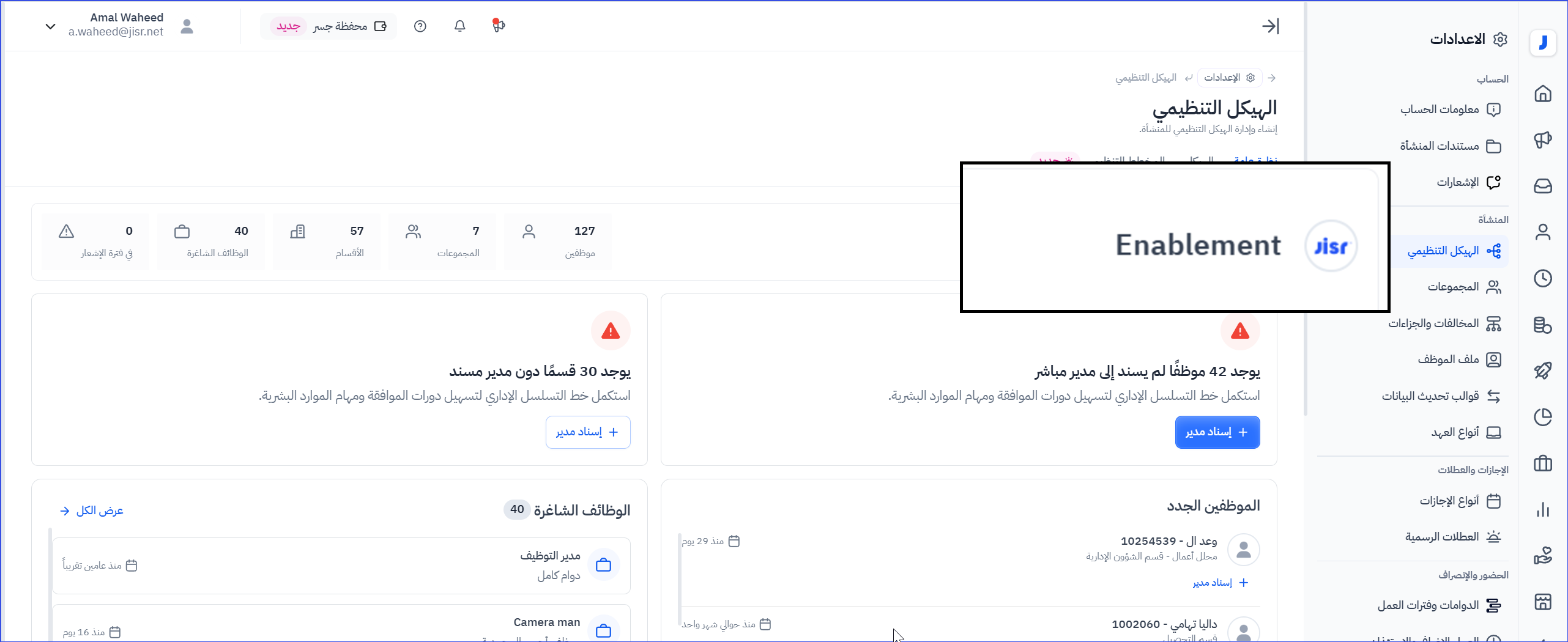 هو القسم الأول في تجربة "الهيكل التنظيمي"، ويعرض ملخصًا حيًّا لحالة الشركة وهيكلها، بطريقة تفاعلية وموجزة.
