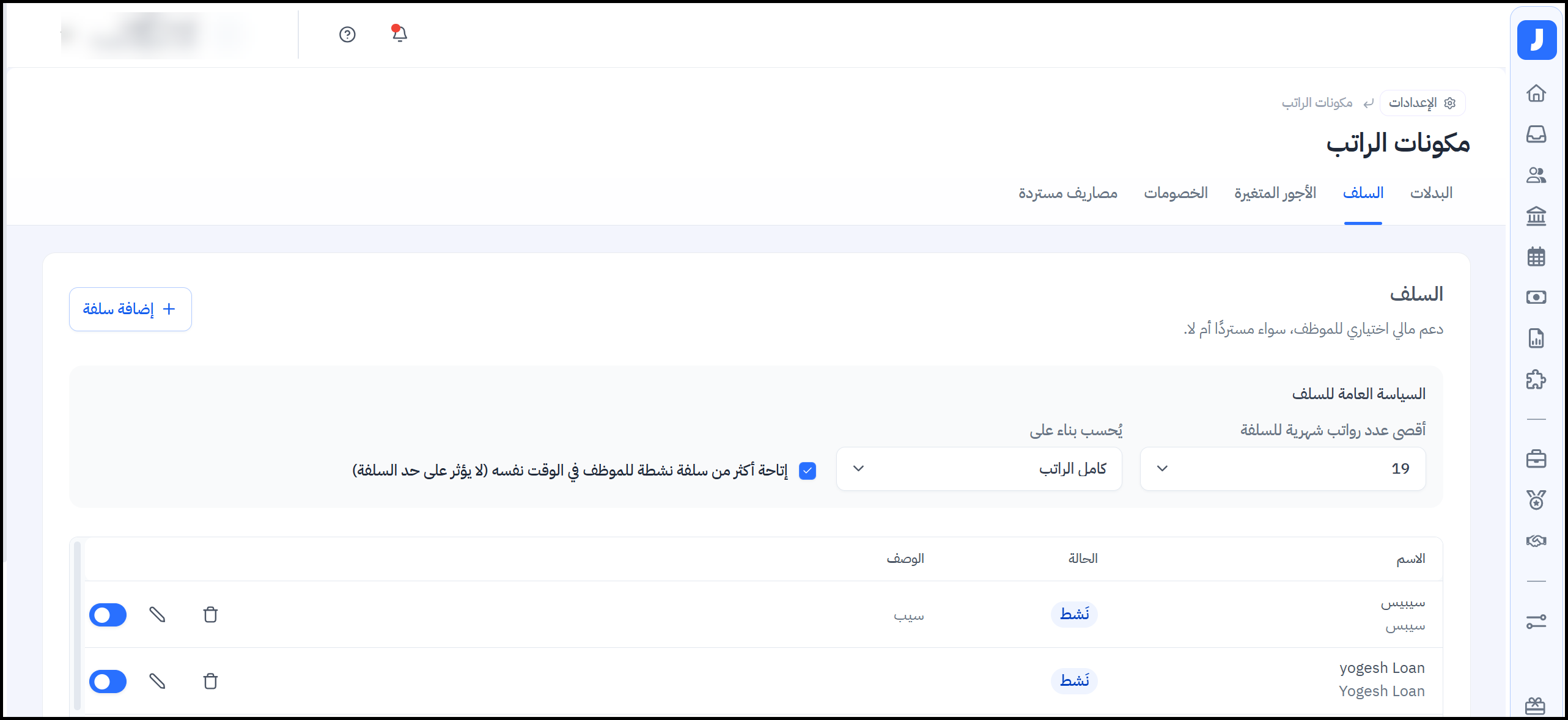 ملحوظة: إذا تم تحديد النوع "سلفة" يمكن اختيار طريقة احتساب السلفة، وأقصى عدد رواتب شهرية للسلفة، وإمكانية إضافة أكثر من سلفة نشطة للموظف في الوقت نفسه.