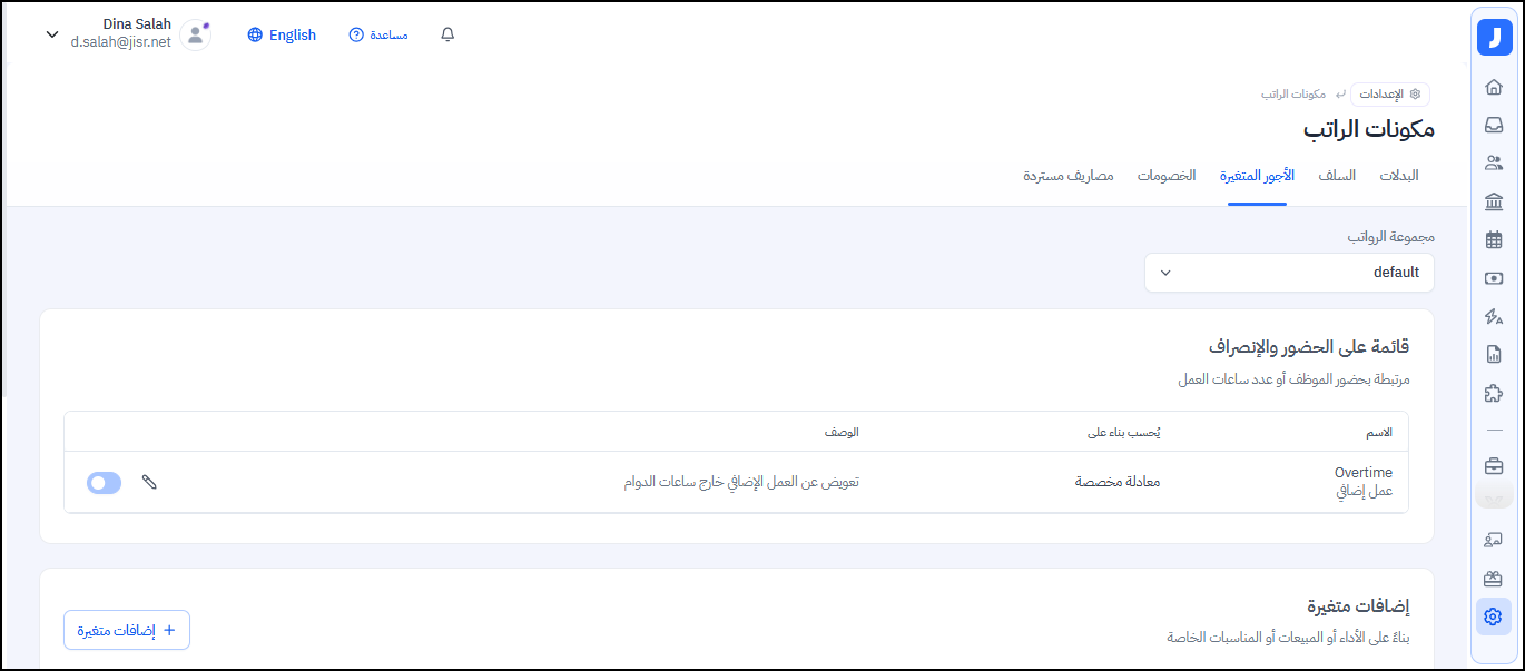 2- لتعريف سياسة الأجور المتغيرة الجديدة في النظام يقوم المستخدم بالنقر على "إضافات متغيرة"