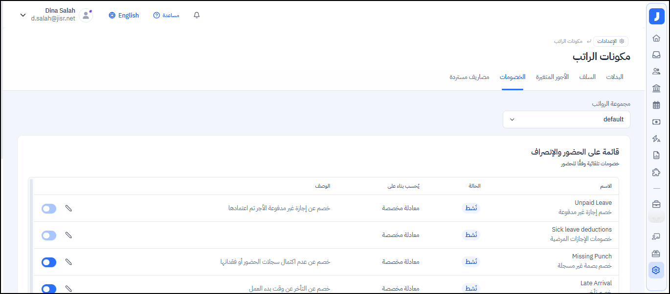 يمكن تحديد صيغة مرنة وديناميكية لحساب قيمة الخصومات بناءً على الحضور والانصراف، بدلاً من إدخال قيمة ثابتة، وذلك من خلال إنشاء معادلة وتحديد العناصر المتواجدة بالمعادلة لإنشاء طريقة احتساب الخصم.