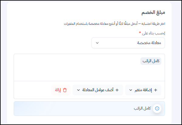 يتم احتساب ا لخصم لبناءً على المعادلة التي يمكن إن ينشأها المستخدم، من خلال تحديد العناصر المتواجدة بالمعادلة لإنشاء طريقة احتساب الخصم.