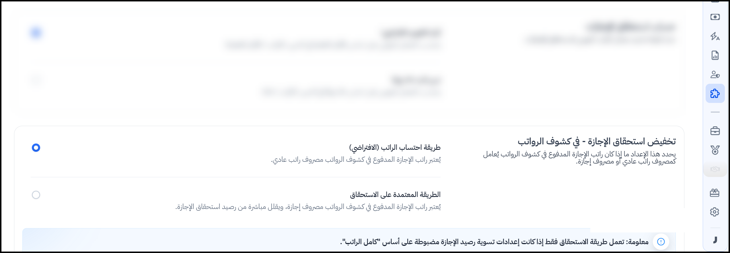 ملحوظة مهمة: تعمل الطريقة المعتمدة على الاستحقاق فقط إذا كانت إعدادات تسوية رصيد الإجازة في مسير الرواتب الخاص بالموظفين مضبوطة على أساس "كامل الراتب". هذا يعني أن النظام يفترض أن رصيد الإجازة يتم استحقاقه وتسويته بناءً على إجمالي الراتب المستحق للموظف، مما يتيح التخفيض المباشر من هذا الرصيد عند صرف راتب الإجازة.