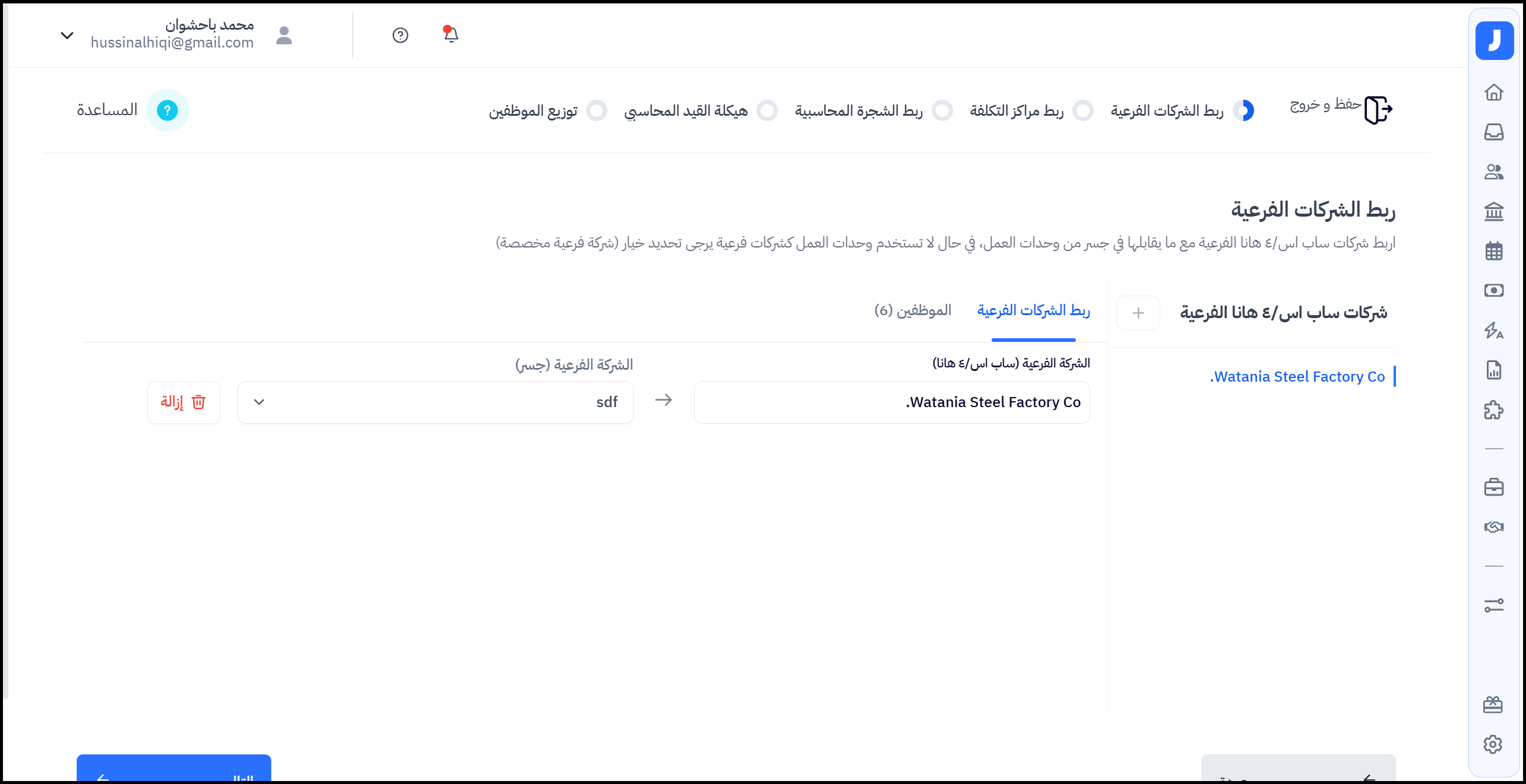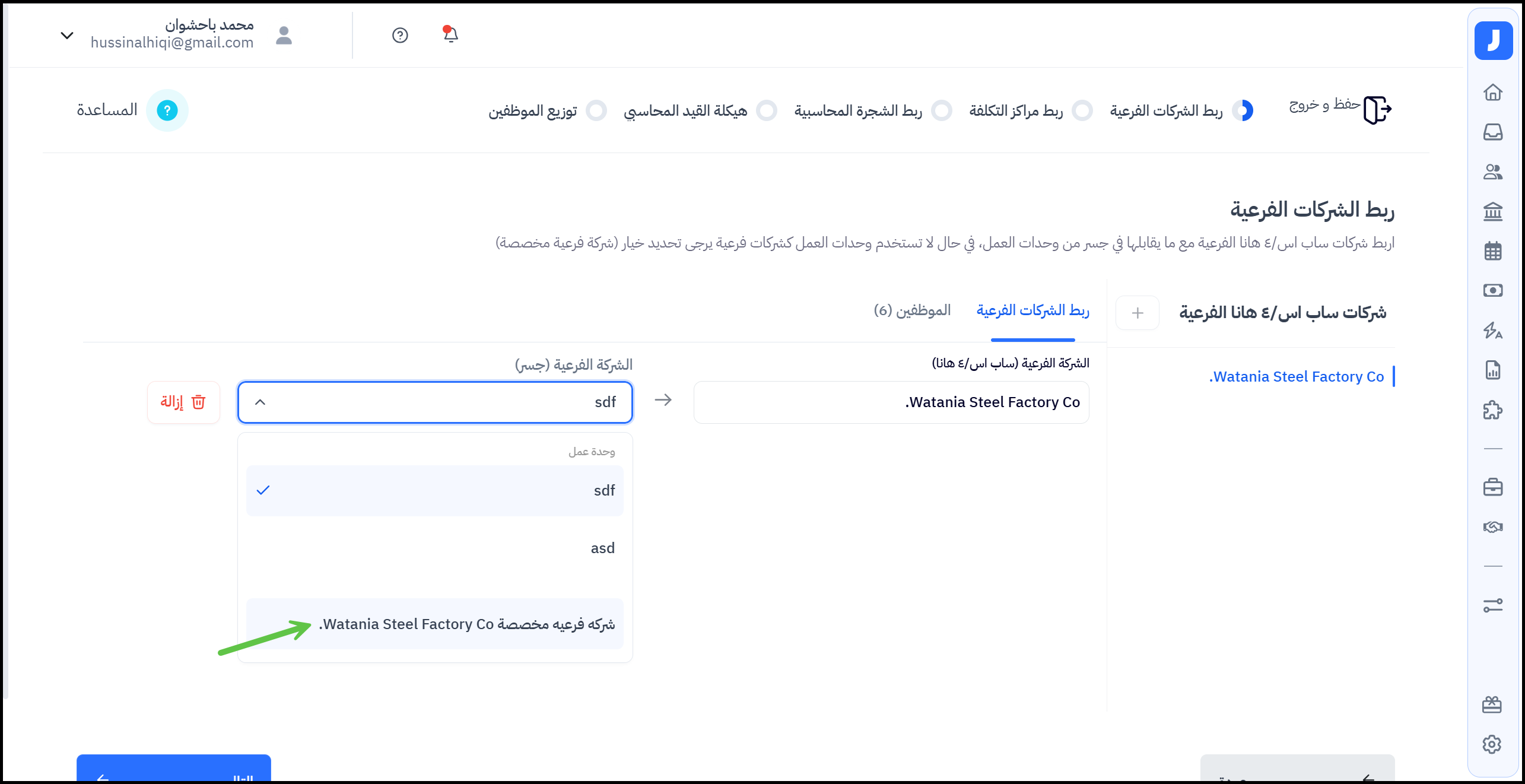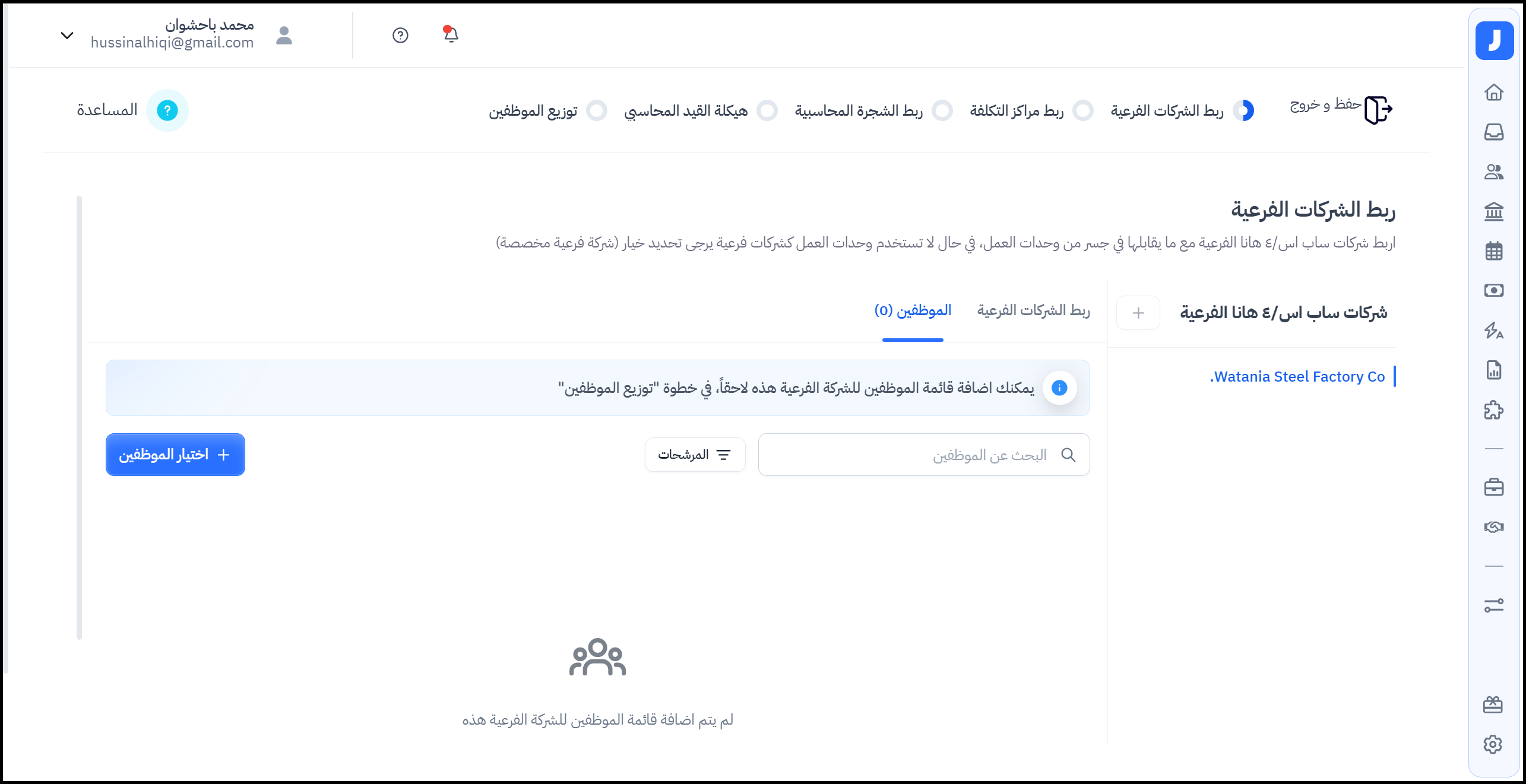 في حال إنشاء شركات فرعية مخصصة، يمكن لمشرف النظام من إضافة الموظفين للشركة الفرعية (إختياري).