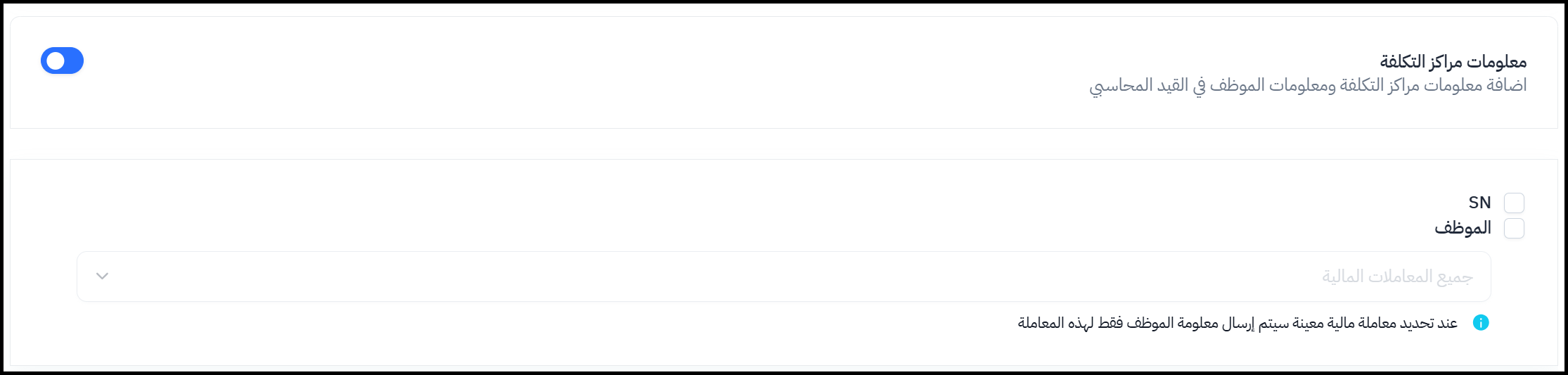 عند قيام المسؤول بتفعيل هذا الخيار واختيار أحد العناصر المتاحة ، سيقوم النظام بإضافة المعلومات الخاصة بالعناصر الذي تم إختيارها وتضمين تفاصيلها في السطر الخاص بالقيد المحاسبي.