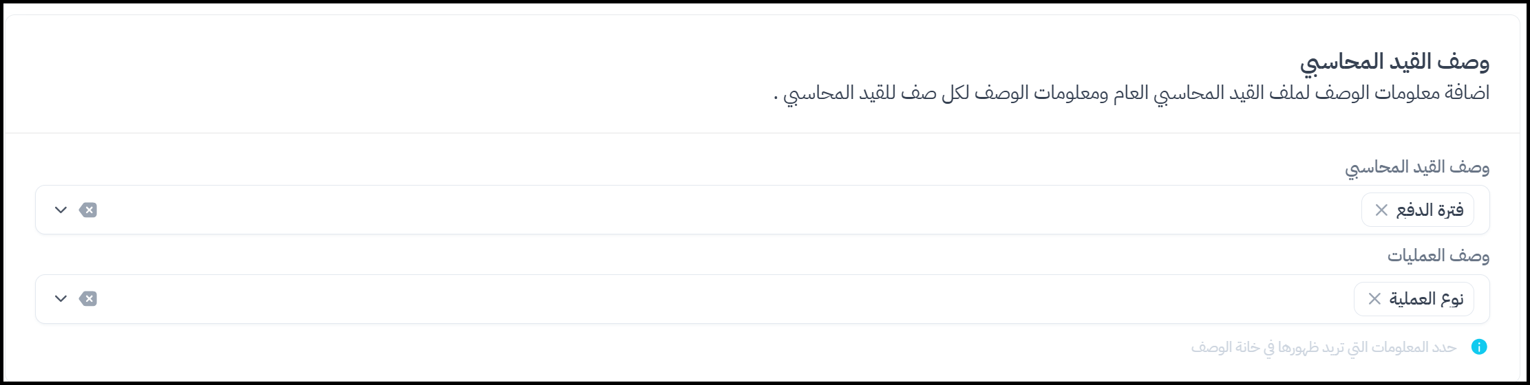 بإمكان المسؤول تخصيص عرض وظهور الوصف الخاص بملف القيود اليومية والسطر الخاص بالقيد المحاسبي عن طريق إختيار المعلومات المطلوب ظهورها .