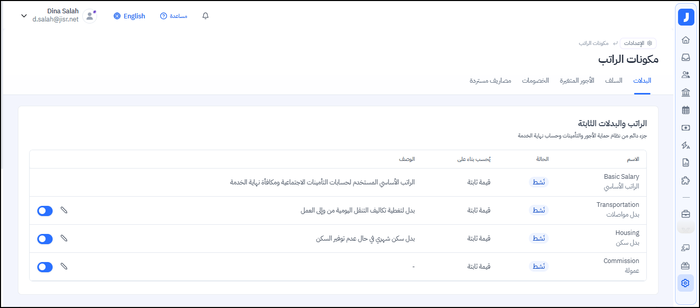 أو يمكن للمستخدم الدخول على تبويب "مكونات الرواتب" لإجراء أي تعديل أو إضافة على مكونات الرواتب مثل البدلات والسلف والأجور المتغيرة والخصومات ومصاريف مستردة.