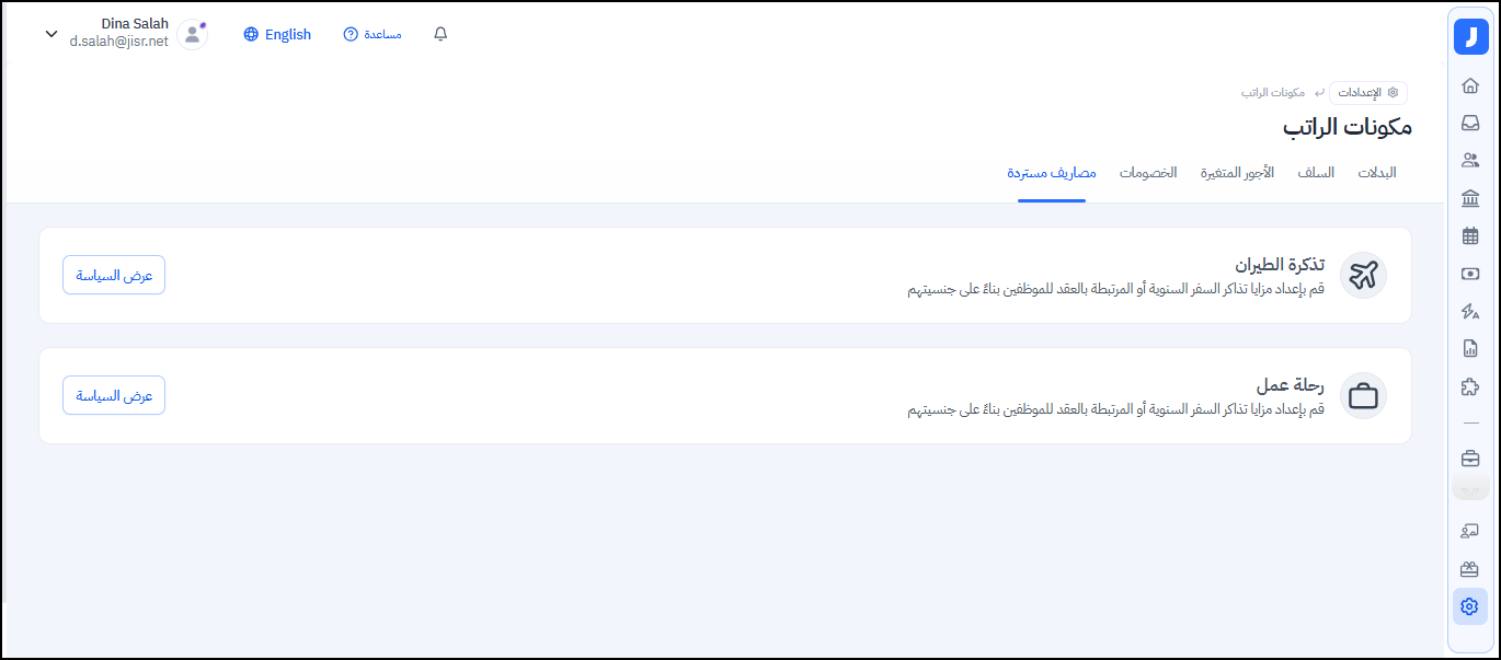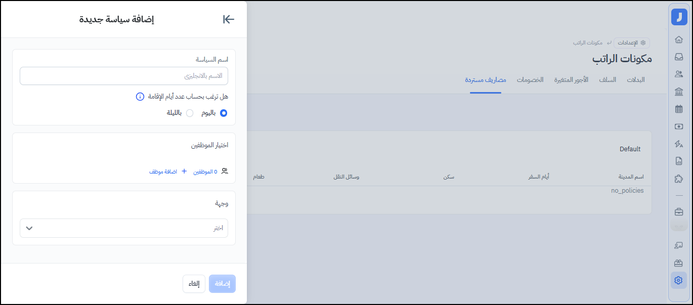 في هذا التبويب يمكن ضبط سياسة تذكرة الطيران ورحلات العمل