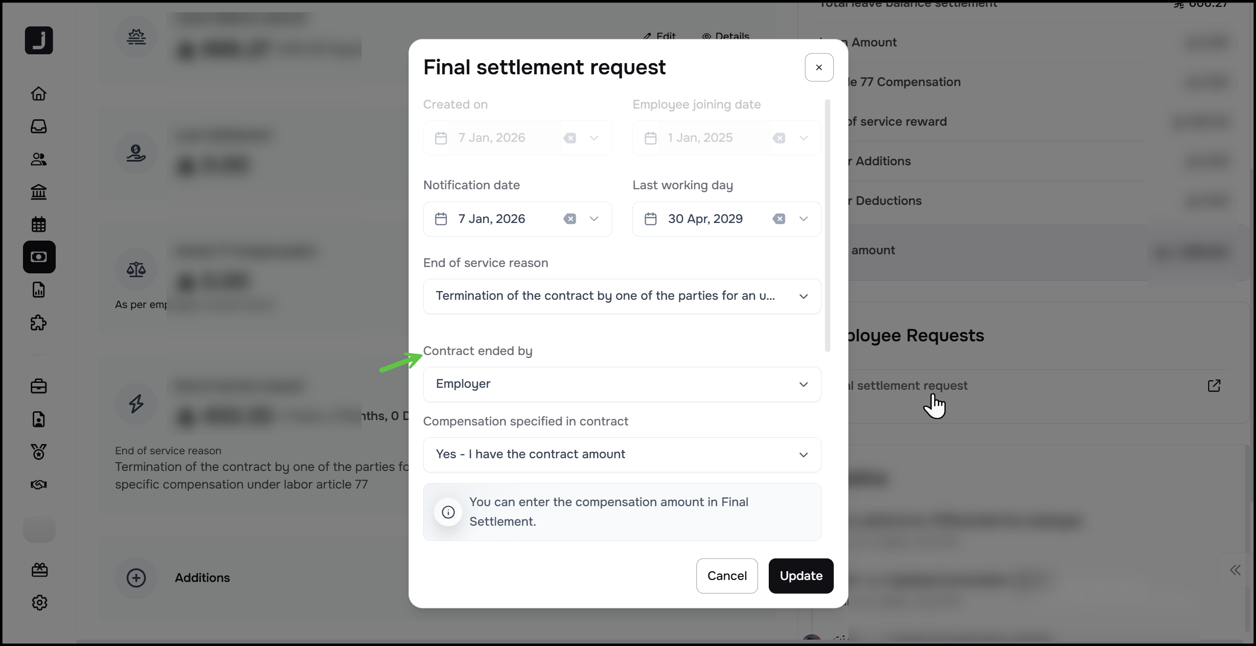 يتيح لك النظام تحديد من الذي قام بإنهاء العقد: هل هو صاحب العمل أم الموظف؟ هذا التحديد جوهري لأن الالتزامات المالية تختلف بناءً على الطرف المبادر بالإنهاء.