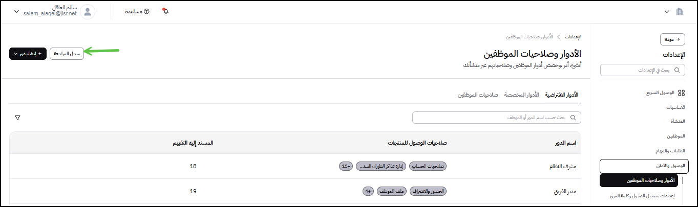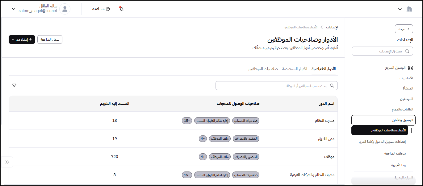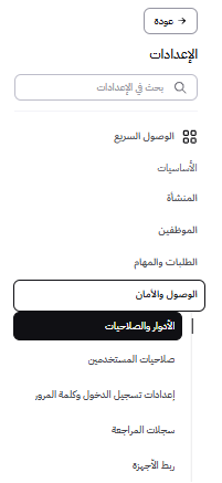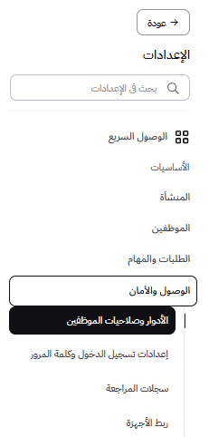 لتبدأ تجربتك بسلاسة، قمنا بنقل وإعادة تنظيم صلاحيات النظام. يمكنك الآن الوصول إلى إعدادات الصلاحيات والأدوار بسهولة عبر القائمة الرئيسية من خلال تبويب "الوصول والأمان" ثم اختيار "الأدوار وصلاحيات الموظفين"، المصمم ليكون مدخلك الموحد لكل ما يتعلق بإدارة فرقك وصلاحياتهم.