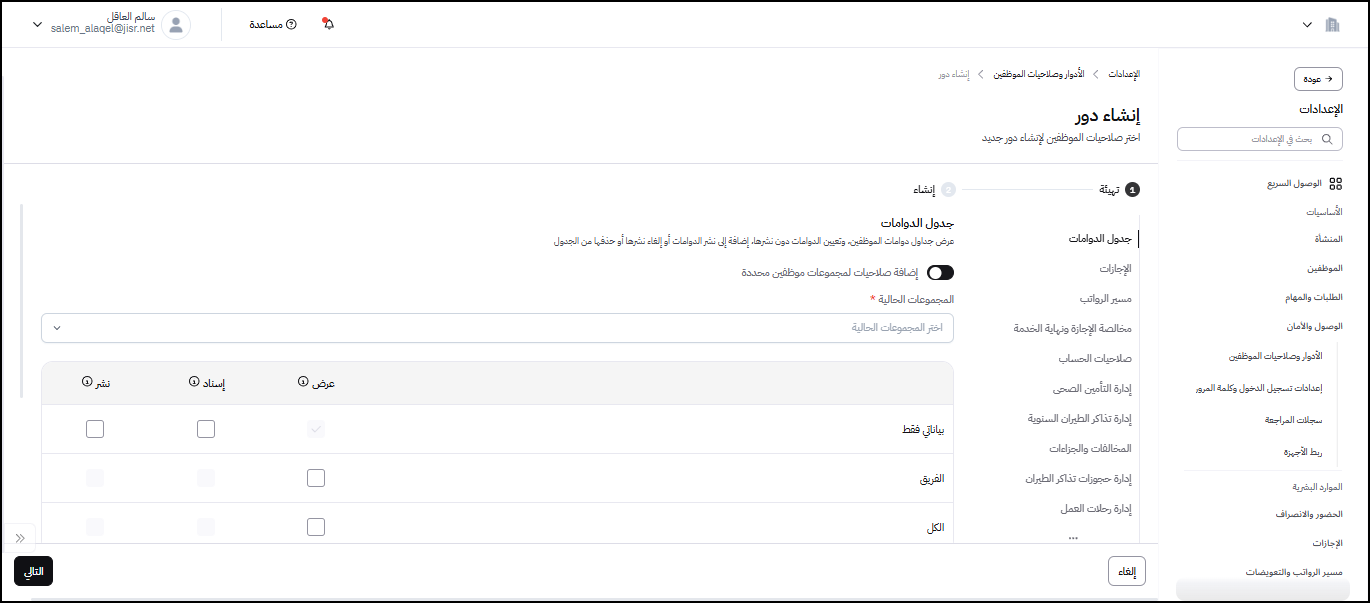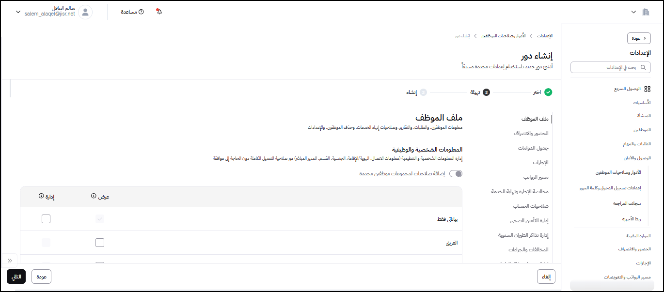 لم يعد إنشاء دور جديد يعني البدء من الصفر. الآن، يمكنك اختيار أحد الأدوار المعرفة سابقًا في النظام، سواء الافتراضية أو المخصصة، واستخدامه كقالب للدور الجديد (مثل مدير موارد بشرية). يمكنك بالطبع مراجعة وتعديل الصلاحيات المعرفة في الدور قبل الحفظ، مما يضمن لك السرعة والدقة ويقلل من الأخطاء البشرية.
